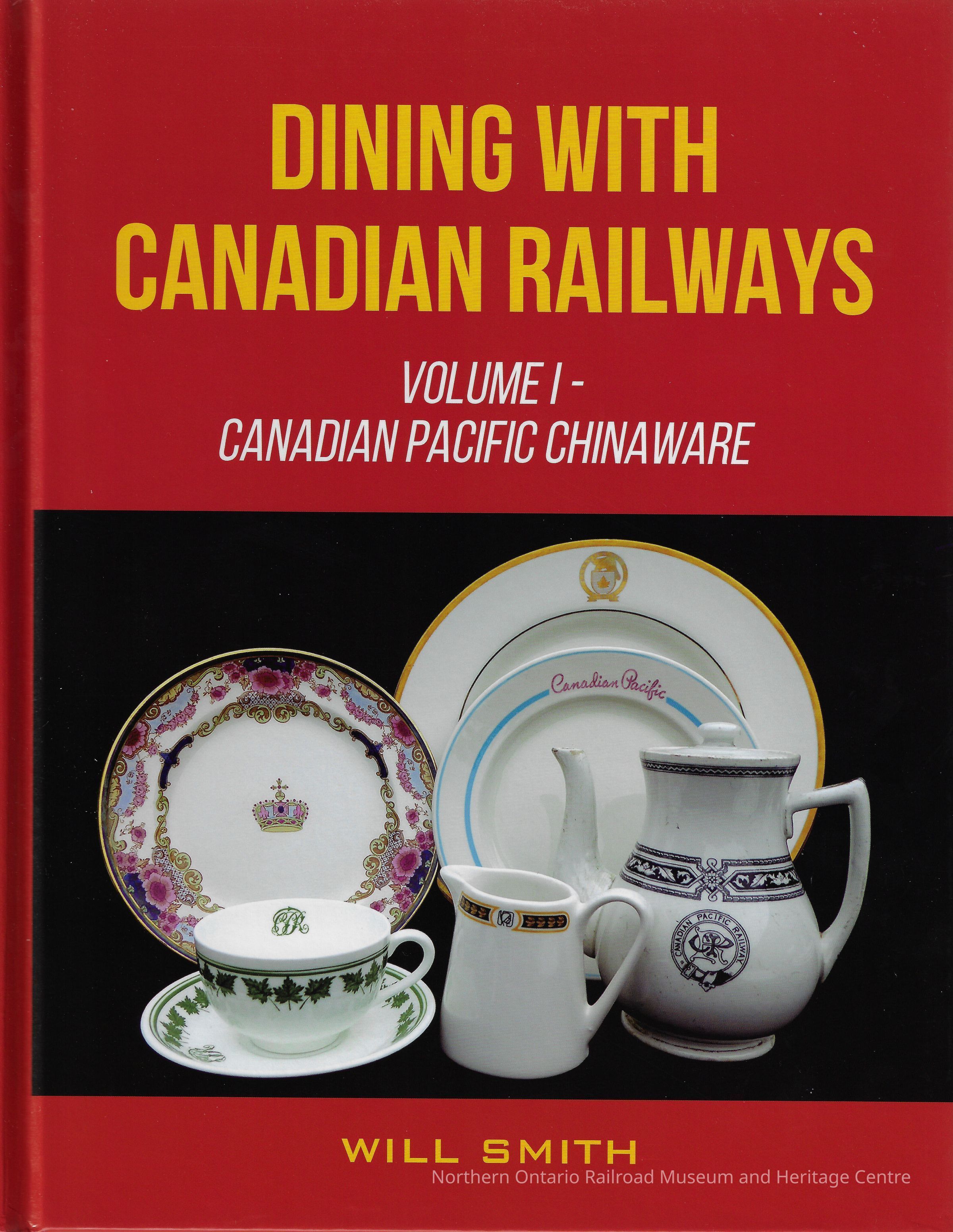 Volume 1 of Will Smith's planned series of publications "Dining with Canadian Railways". This volume, titled "Canadian Pacific Chinaware", documents more than 250 chinaware patterns used on the CPR dining cars, aswell as Canadian Pacific's steamships, hotels, airlines, and restaurants. A map of the Canadian Pacific Railway is printed on the inside front and inside rear covers. There are 248 numbered pages. The book is bound in a red hard cover. On the front cover is a colour photograph of various chinaware centered below the title, which is printed in yellow and white text); the name of the author is printed in yellow below the photo. Centered on the rear cover is a reproduction of a CPR poster, featuring an image of a train in the Rockies in British Columbia, with the text "By Train Through the Canadian Rockies. Below is a short description of the book's contents.Collection