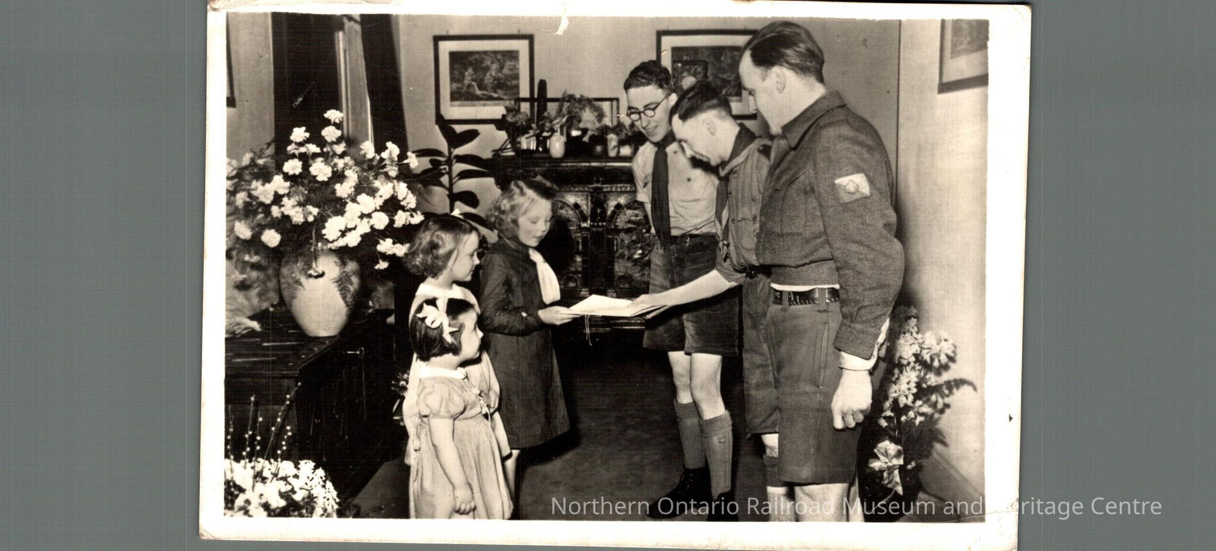 Postcard sent to Mrs. M Carrise in Capreol ON from the Netherlands in 1947. Text is in Dutch. Front image is of three boys dressed as either boy scouts or cadets giving a letter to three young girls in what appears to be a parlor or living room.Context