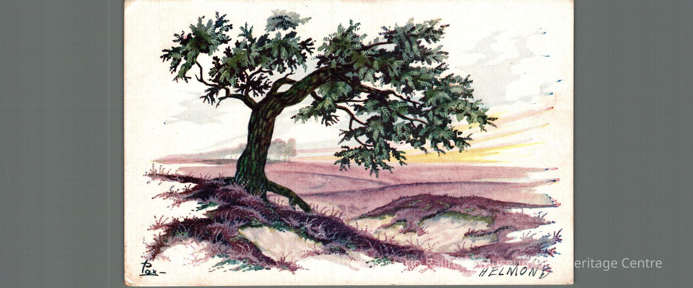 Postcard sent to Mr. and Mrs. M Carrise in Ottawa ON from the Netherlands in 1946. Text is in English, front image is a painting of a tree captioned "Helmond"Context