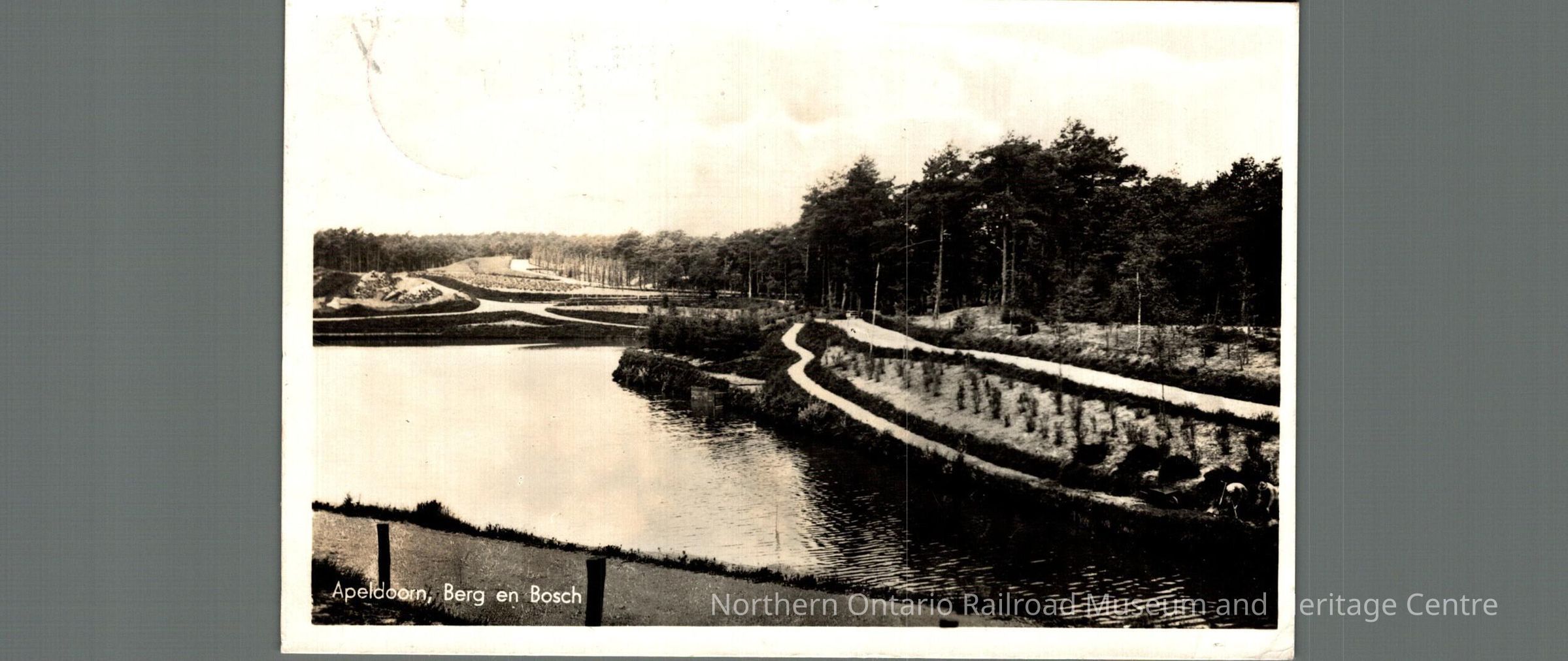 Postcard sent to Mr. M Carrise in Capreol ON from the Netherlands in 1947. Text is in English, front is an image of a river or lake captioned "Apeldoorn Berg en Bosch"Context