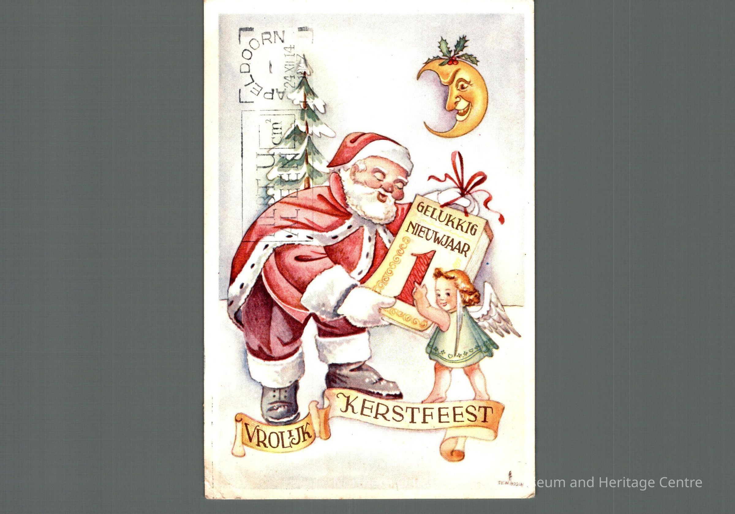 Postcard sent to Mr. Max Carisse in Capreol from the Netherlands in 1947. It is signed as "papa" front image is of santa claus holding a calendar with an angel captioned "vrolijk kerstfeest" assuming to mean a holiday greeting.Context