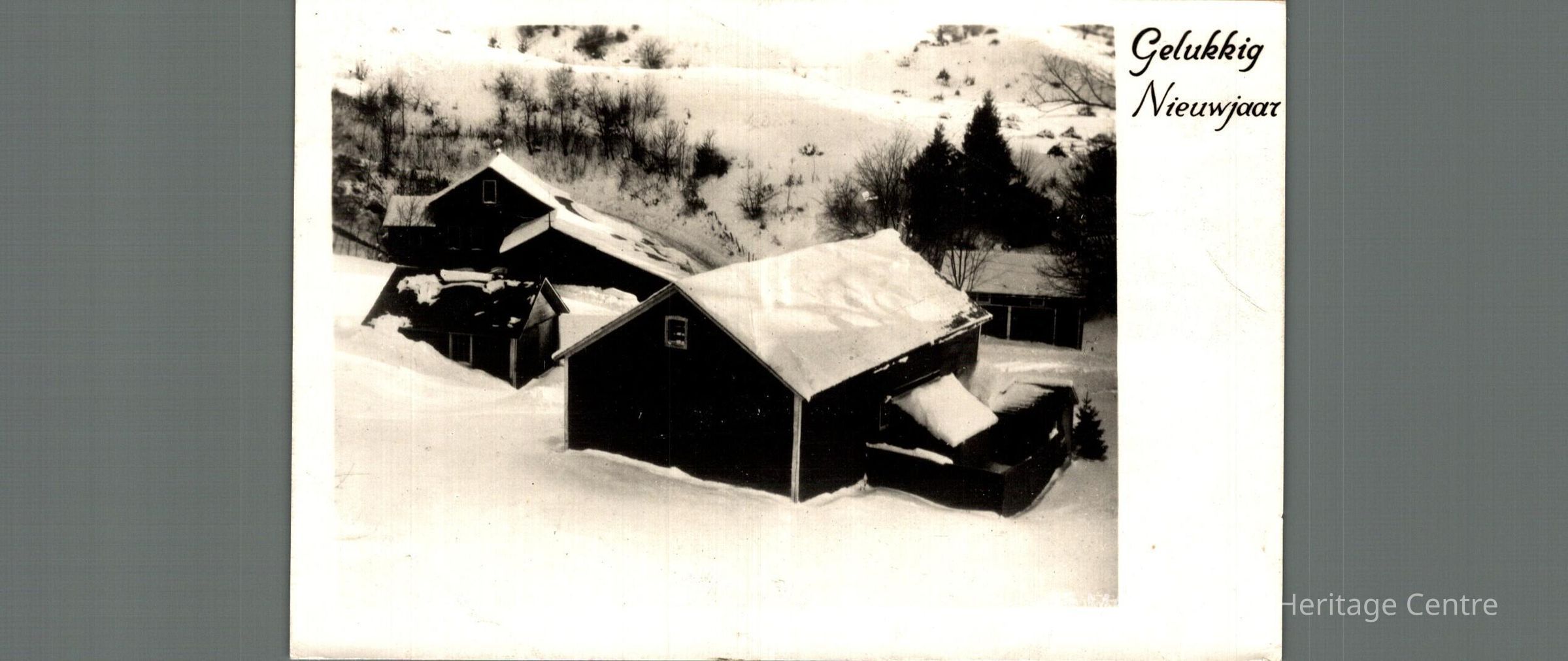 Postcard sent to Mrs. D Carrise in Capreol ON from the Netherlands in 1947. Text reads "with kind thoughts and best wishes for Christmas and the New Year very happy 1948" with a signature. Front image is of a snow covered barn and other houses captioned "Gelukkig Nieuwjaar" (happy new year)Context