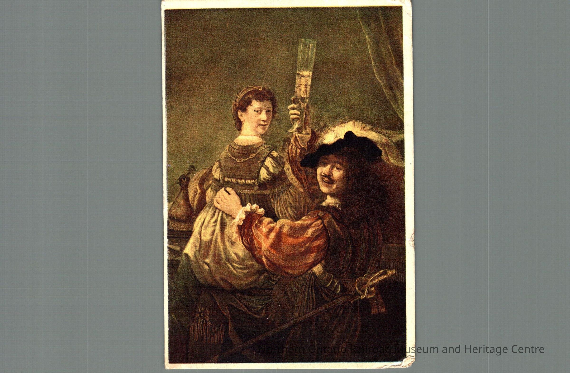 Postcard sent to Mrs M Carrise in Capreol ON from the Netherlands in 1946. Text is signatures, image on front is a painting of a man and a woman, dressed in Elizabethan style clothing, the man is hoisting a glass.Context