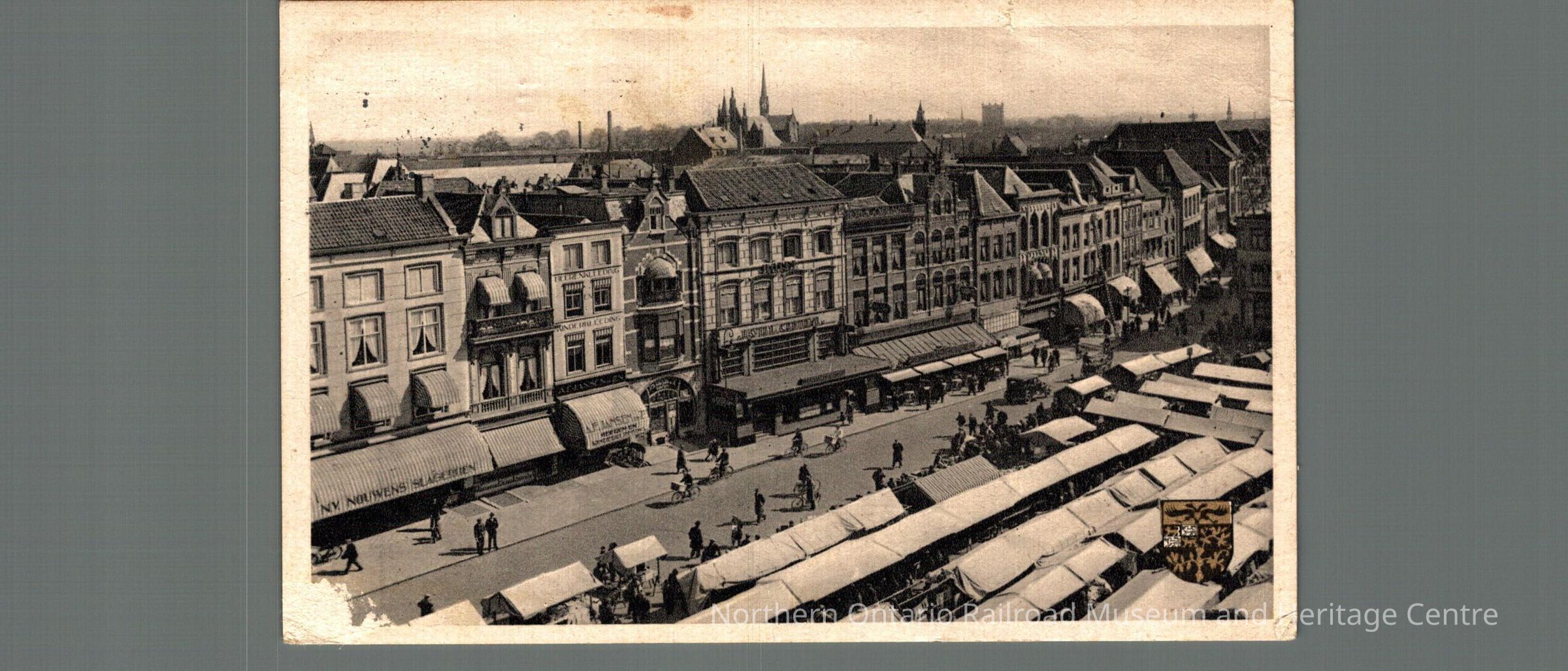 Postcard sent to Mrs. M Carrise in Ottawa ON from the Netherlands in 1946. Signatures on back, front is an image of a city, captioned "Hertogenbosch markt"Context