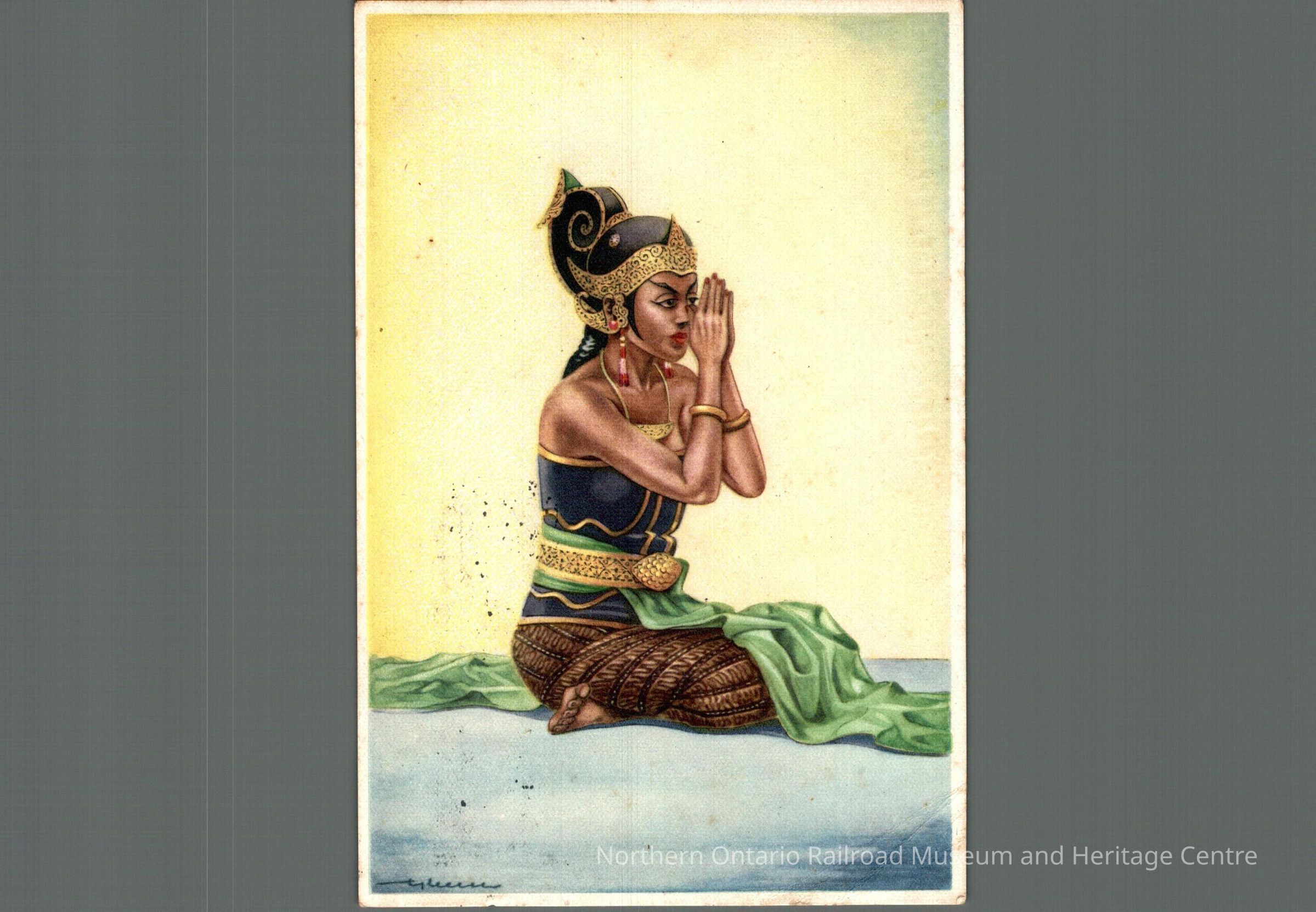 Postcard sent to Mrs. D Carisse in Ottawa ON from the Netherlands in 1948. The text is just a signature, front image is of an Indian woman who appears to be praying.Context