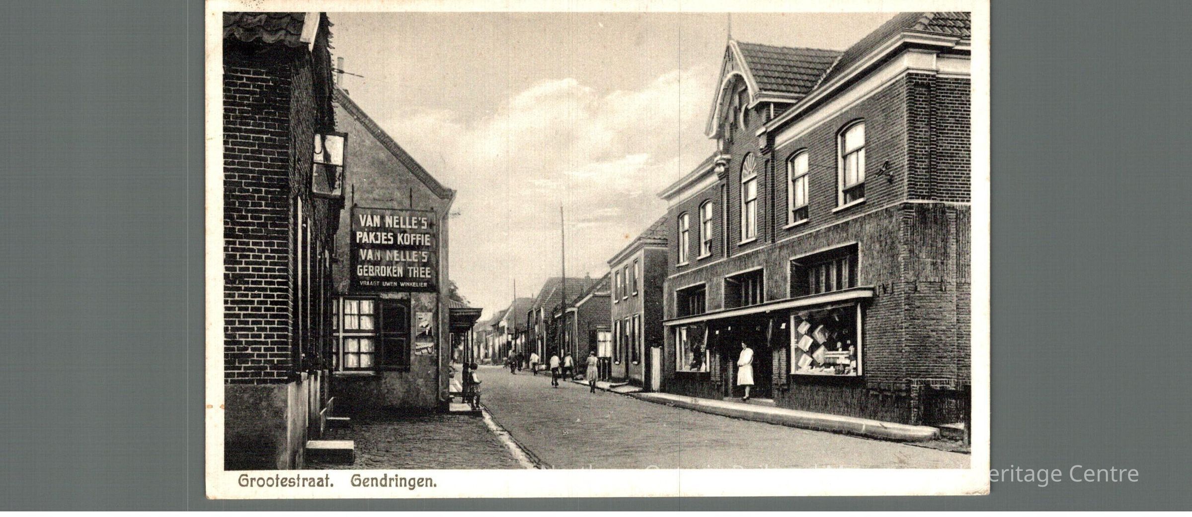 Postcard sent to Mr. M Carrise in Ottawa ON from the Netherlands, year unknown due to the stamp being illegible. Signed from Mama and Papa, front image is of city street, captioned "Gootestraat Gendringen"Context