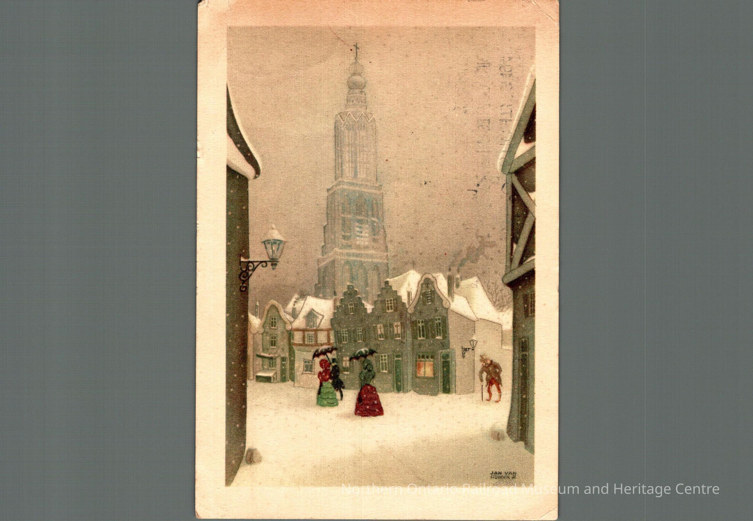 Postcard sent to Mr. and Mrs. M Carrise in Capreol ON from the Netherlands in 1946. Text is in Dutch, front image is of a snow-covered city with four people walking.Context