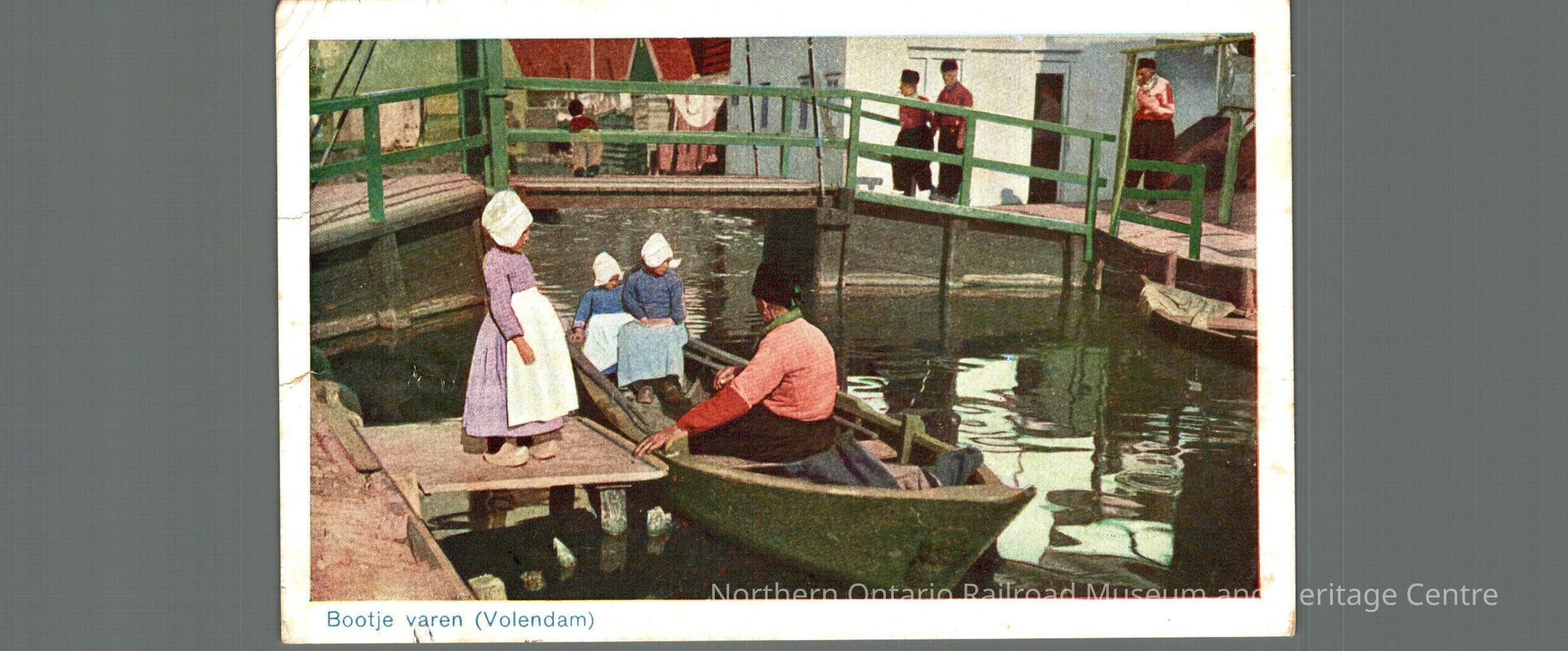Postcard sent to Mrs. D Carrise in Capreol ON from the Netherlands in 1946. Text is just a signature, front image is of a man with three children on a boat, all are dressed in Dutch costumes, it is captioned "Bootje varen (Volendam)Context