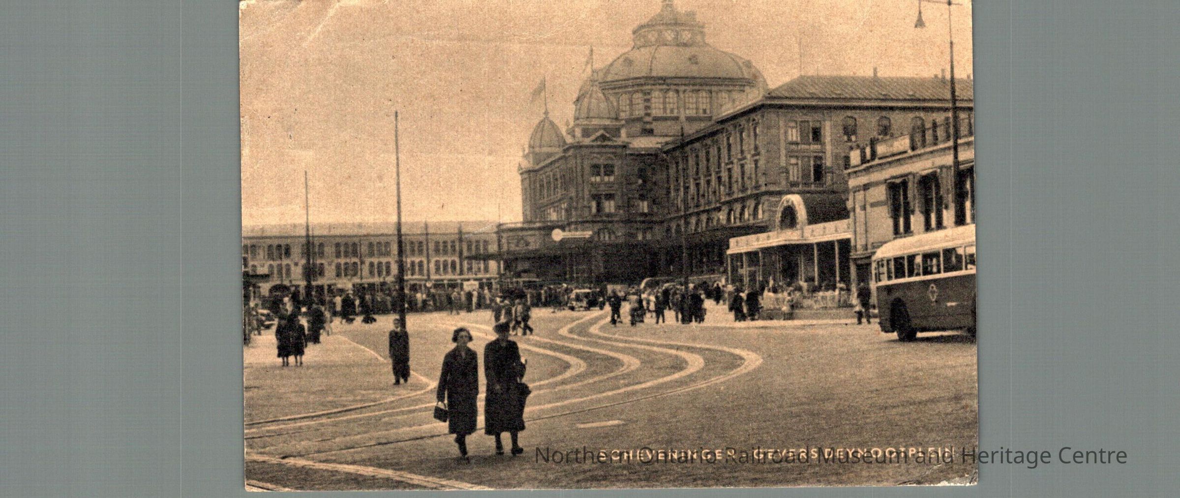 A postcard sent to Mr. and Mrs. M Carrise in Capreol ON from the Netherlands in 1947. The text is written in Dutch and the front is an image of the "Scheveningen- Gevers Deynootplein" in Holland.Context