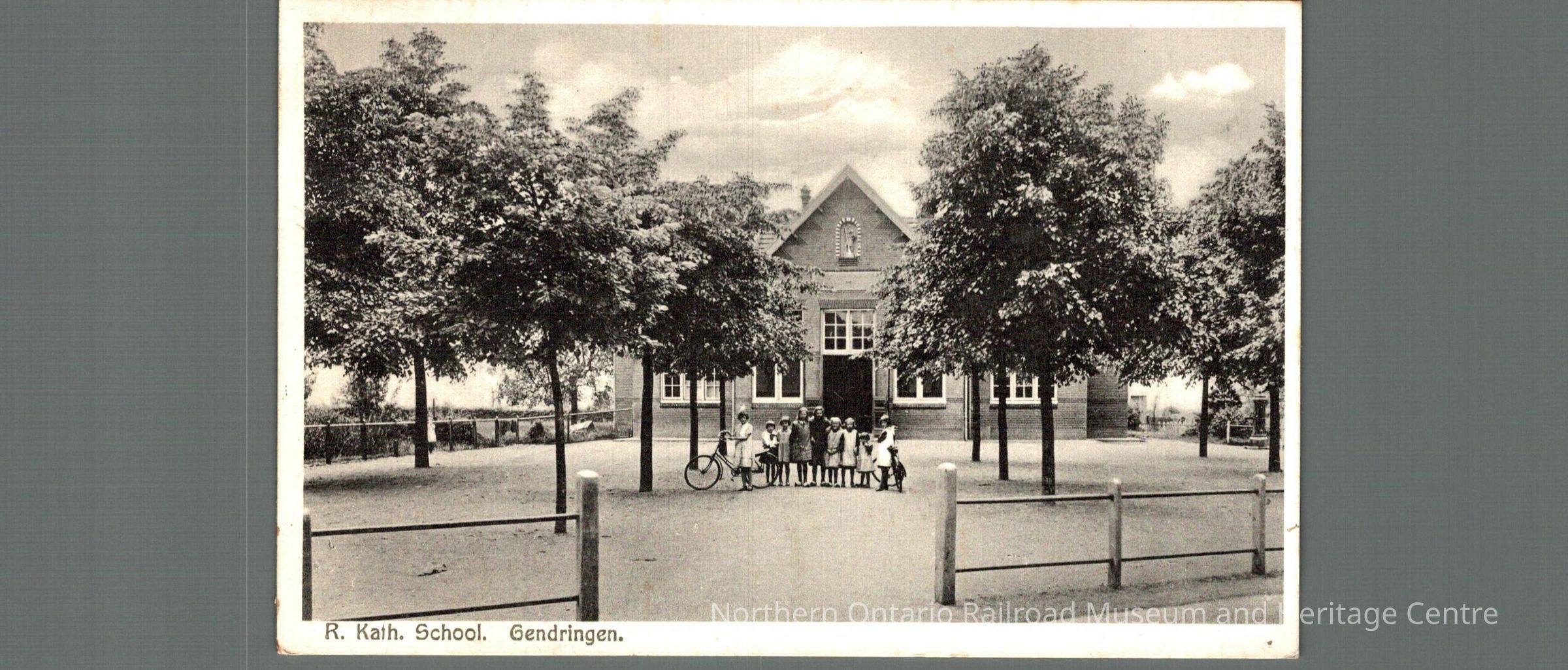 Postcard sent to Mr. M Carisse in Ottawa ON from the Netherlands in 1946. Signed from Mama and Papa. Front image is of a school with children standing in front of it captioned "R. Kath. School. Gendringen"Context