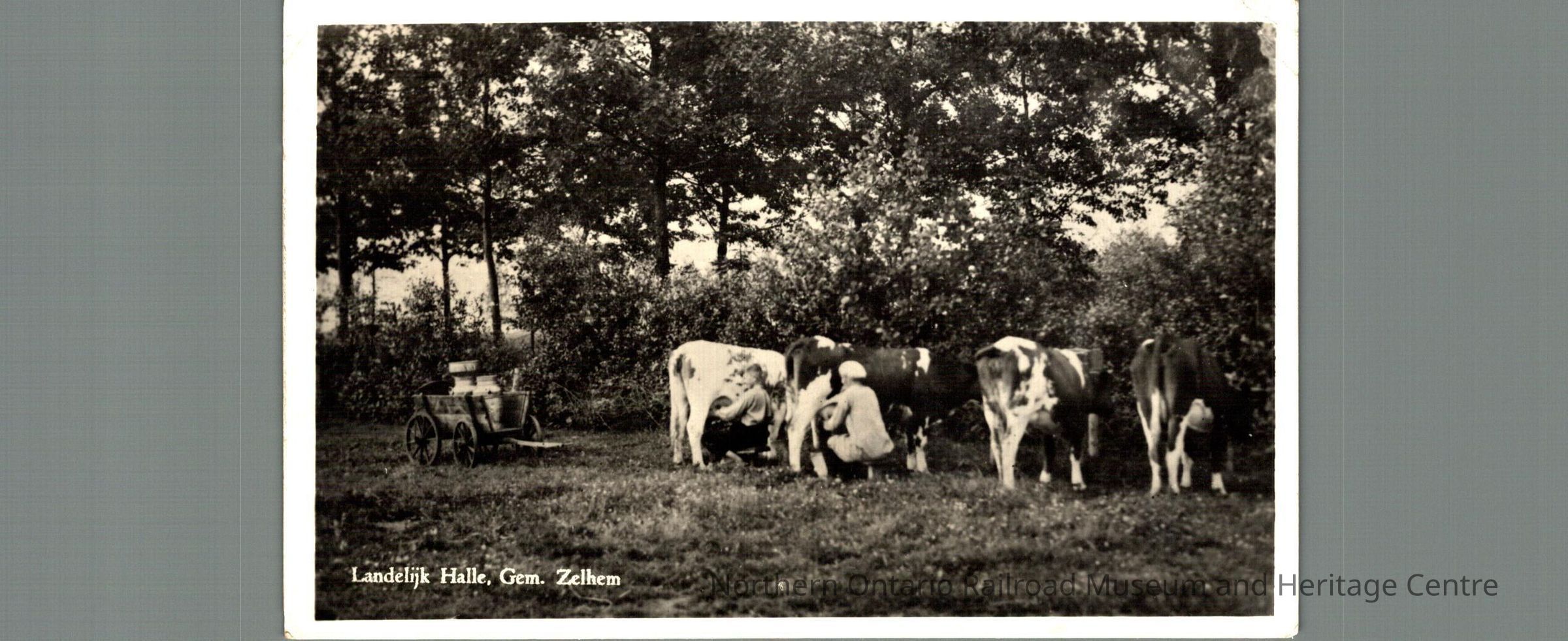 Postcard sent to Mr. and Mrs. Carrise in Capreol ON from Doetinchem Netherlands in 1947. Text is in Dutch. Front is an image of a man milking cows captioned "Landelijk Halle, Gem. Zelhem."Context