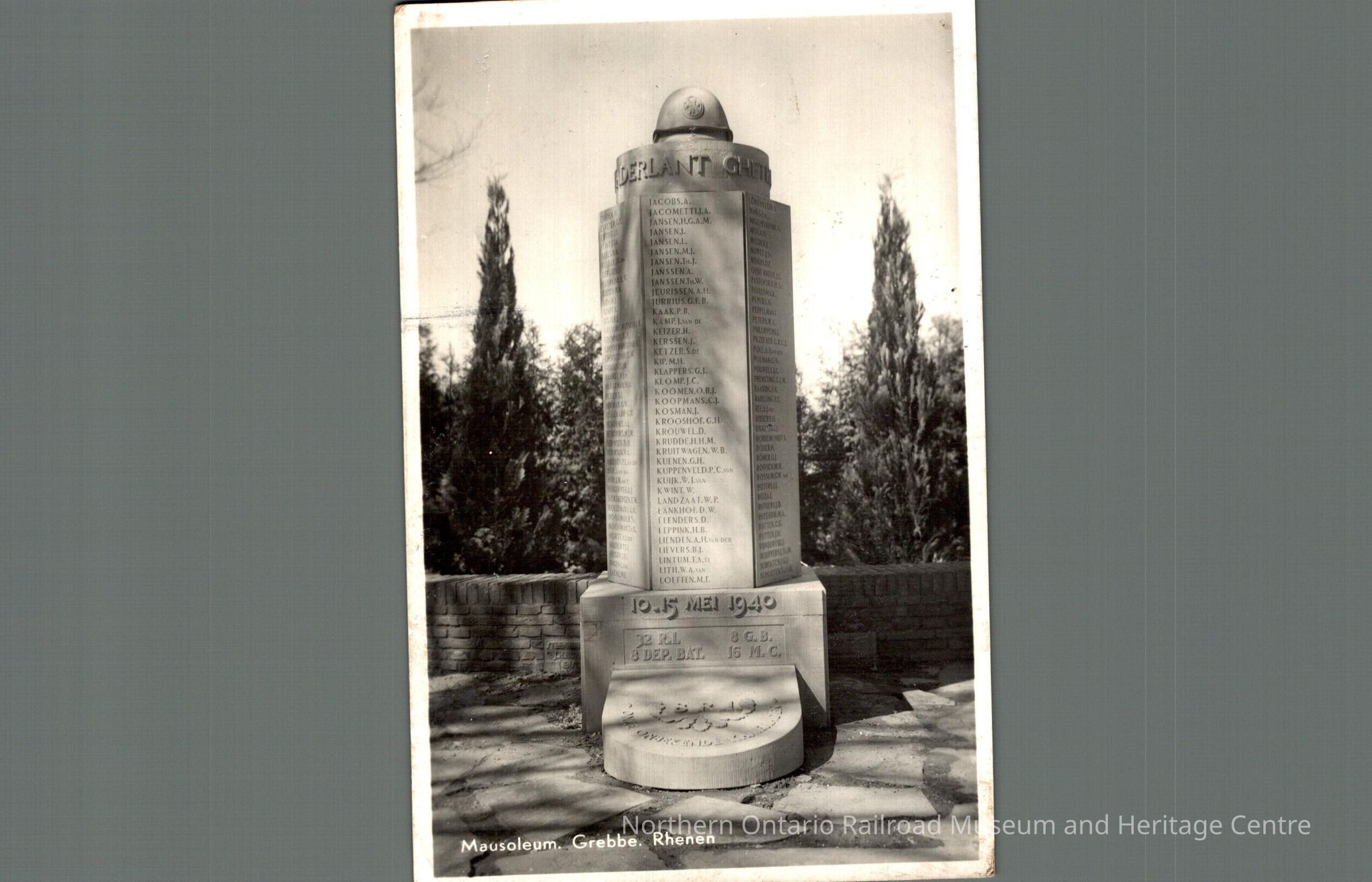 Postcard sent to Mrs. M Carisse in Capreol ON from the Netherlands, text is illegible. Front is an image of some sort of war monument, captioned "Mauso;eum Grebbe Rhenen"Context