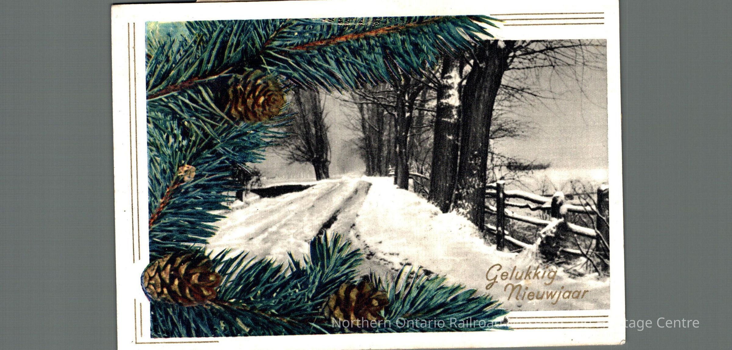 Postcard sent to Mrs. D Carisse in Capreol ON from the Netherlands between 1946-1948 (stamp is unclear). Sent from "Hennry, Aom, Wilherm." Front image is a winter scene captioned "Gelukkig Nieuwjaar" or "Happy New Year"Context