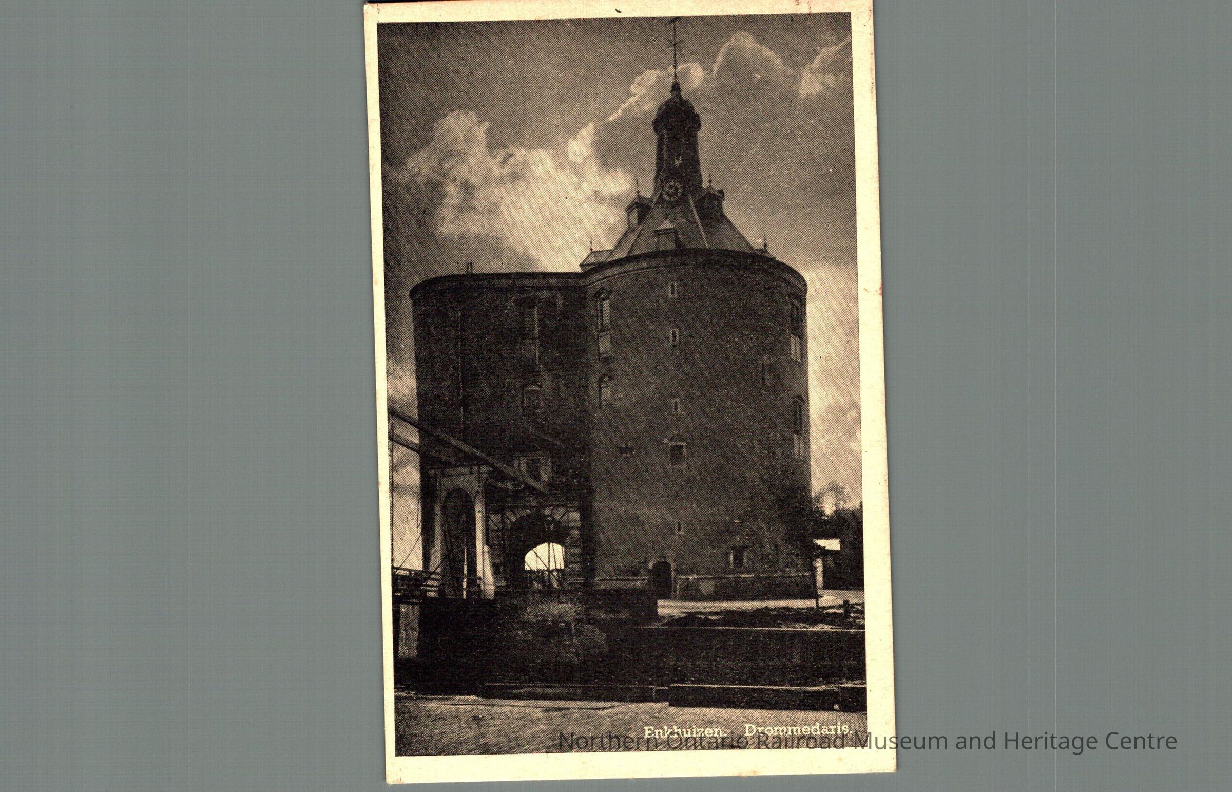 Postcard sent to Mrs. M Carrise in Capreol from the Netherlands in 1947. Signed from mum, front is an image of a building with a large clock and a steeple with the caption "Enkhuizen Drommendaris"Context
