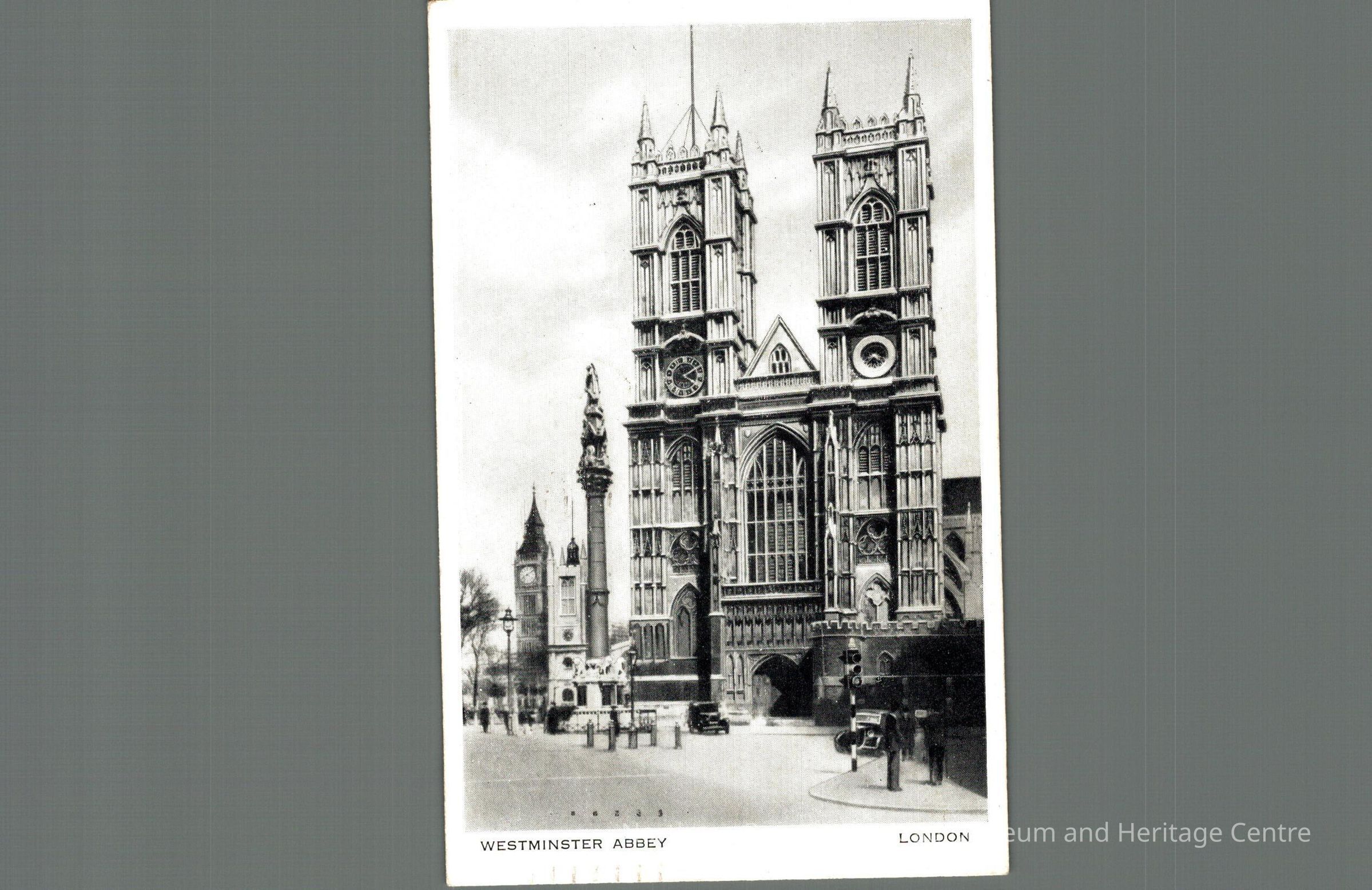 Postcard sent to Mr and Mrs M Carrise in Capreol from Catford, England in 1947. Text reads "love you xxx + papa" assuming it also said moma originally but there is a tear over where the word would be. Front image is of West minister Abbey church in London, England.Context