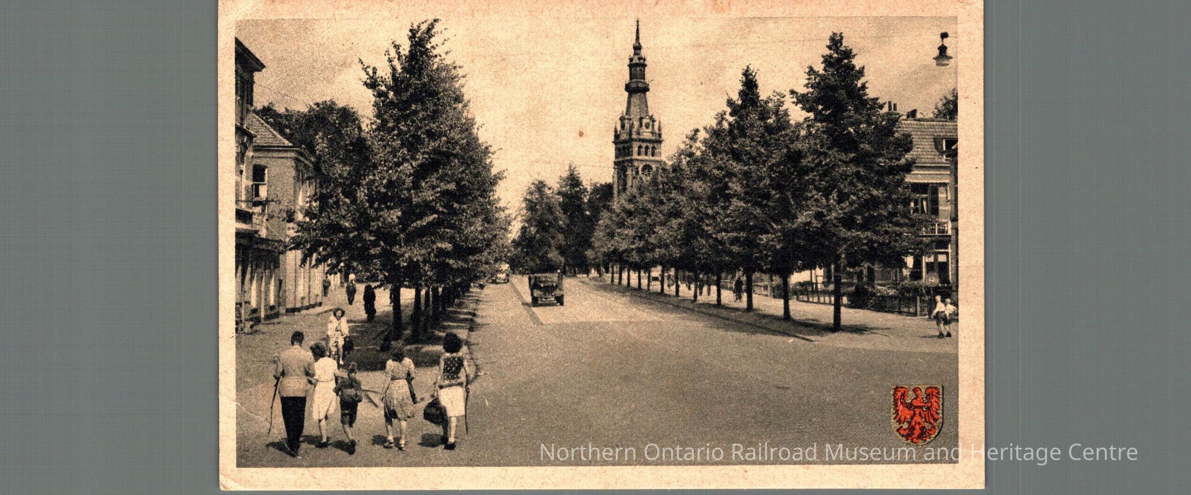 Postcard sent to Mr. M Carrise in Capreol ON from the Netherlands in 1947. Text on the back is mostly signatures. Image on front is of a street with a family walking. It is captioned "Loolaan Apeldoorn"Context