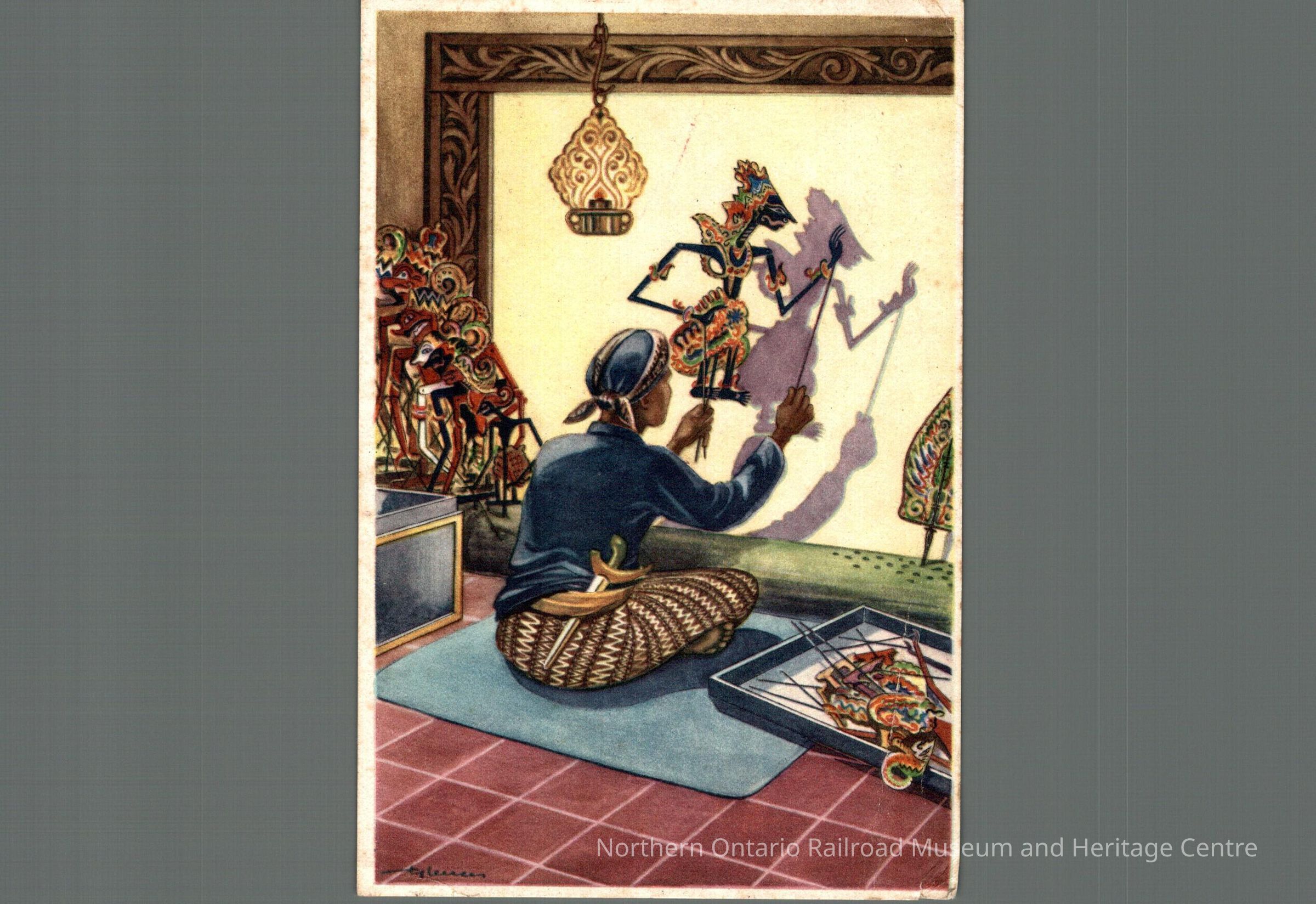 Postcard sent to Mrs. D Carisse in Capreol ON from the Netherlands in 1946. Text is signatures, front image is of a man making a puppet dance.Context