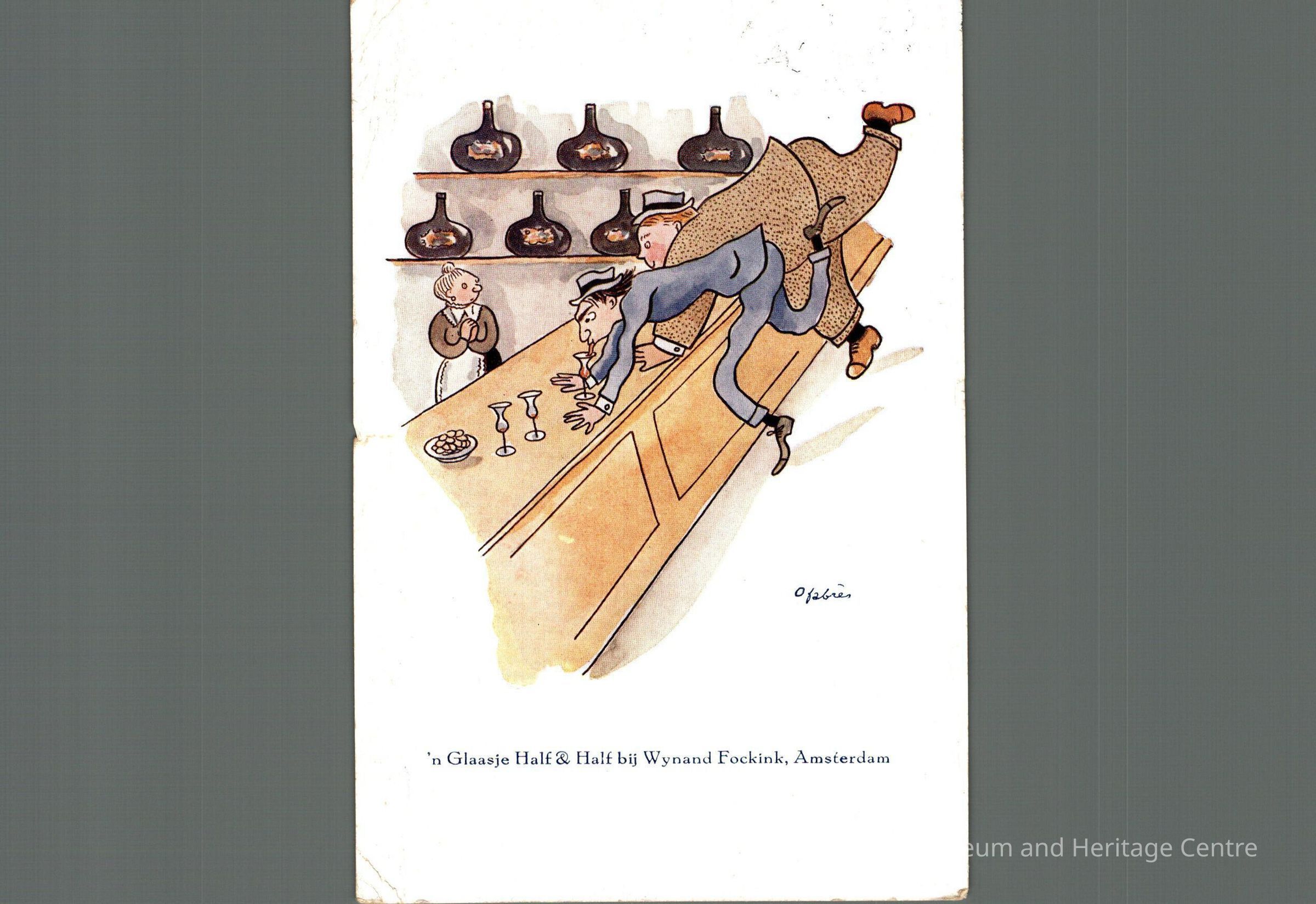 Postcard sent to Mrs. D Carisse in Capreol ON from the Netherlands in 1947. Text is mostly signatures, front image is a comic of two men at a bar doing handstands and drinking alcoholic drinks captioned "'n Glaasje Half & Half bij Wynand Fockink, Amsterdam"Context