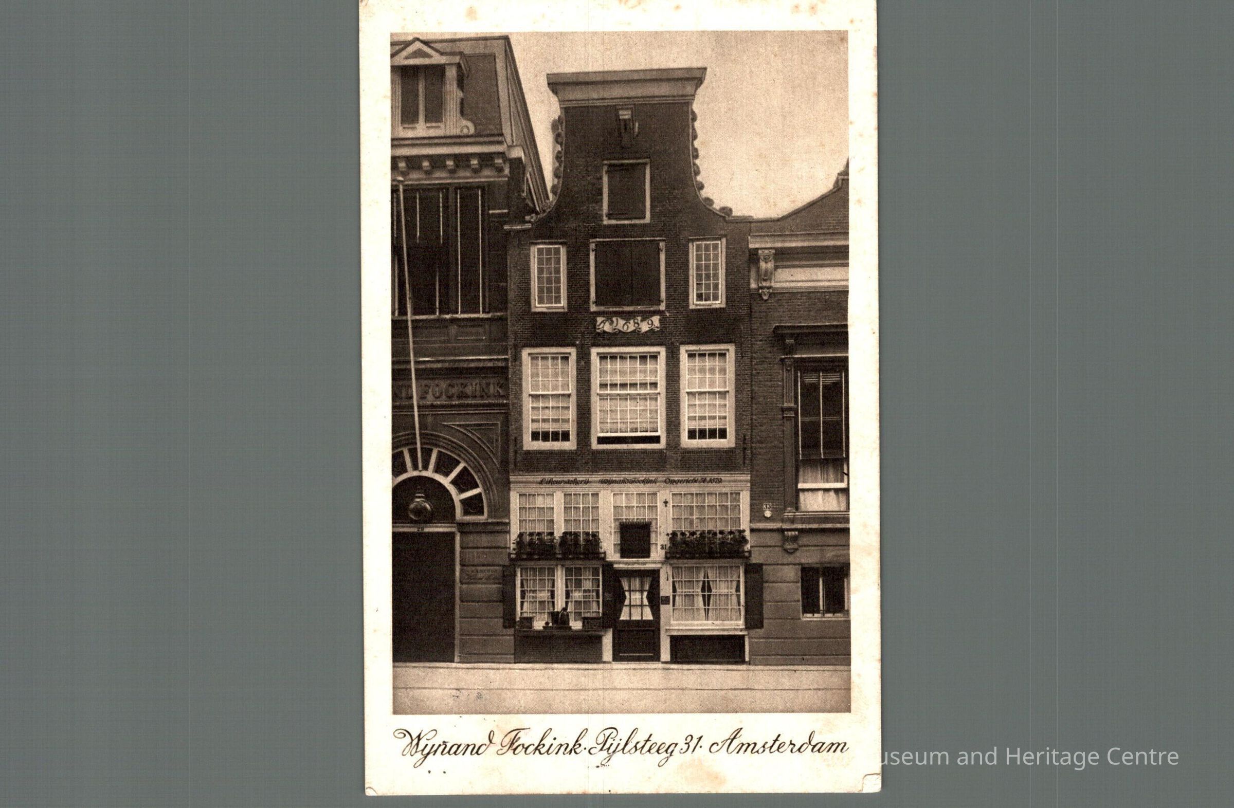 Postcard sent to Mrs. M Carrise in Capreol ON from the Netherlands in 1947. Text is signatures from Mama and Papa. Front image is of a building captioned "Wynand Fockink Pijsteeg 31 Amsterdam"Context