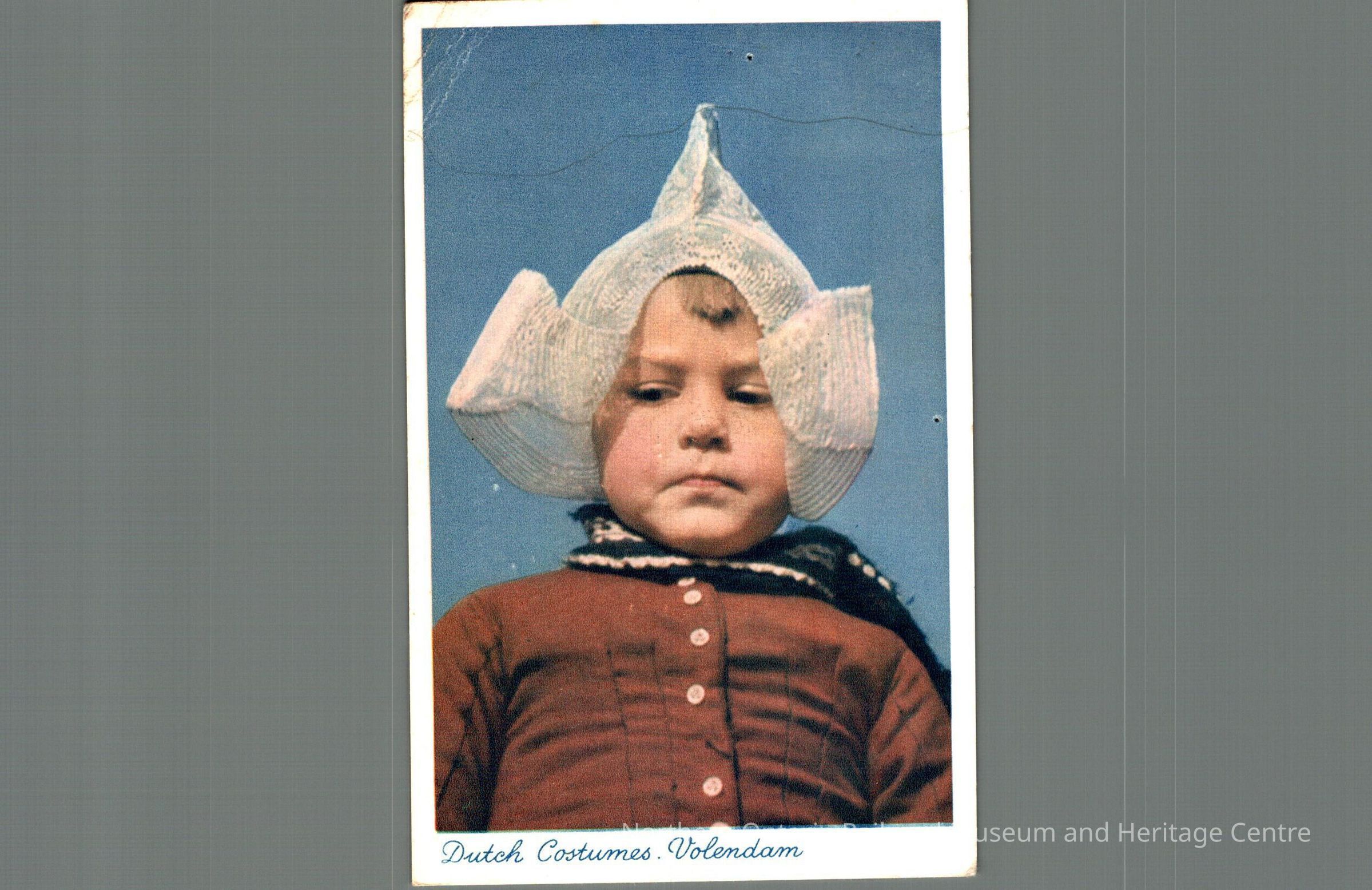 Postcard sent to M Carrisse in Capreol ON from the Netherlands in 1948. Text is written in Dutch, front image is of a young child dressed in Dutch costume captioned "Dutch costumes Volendam"Context
