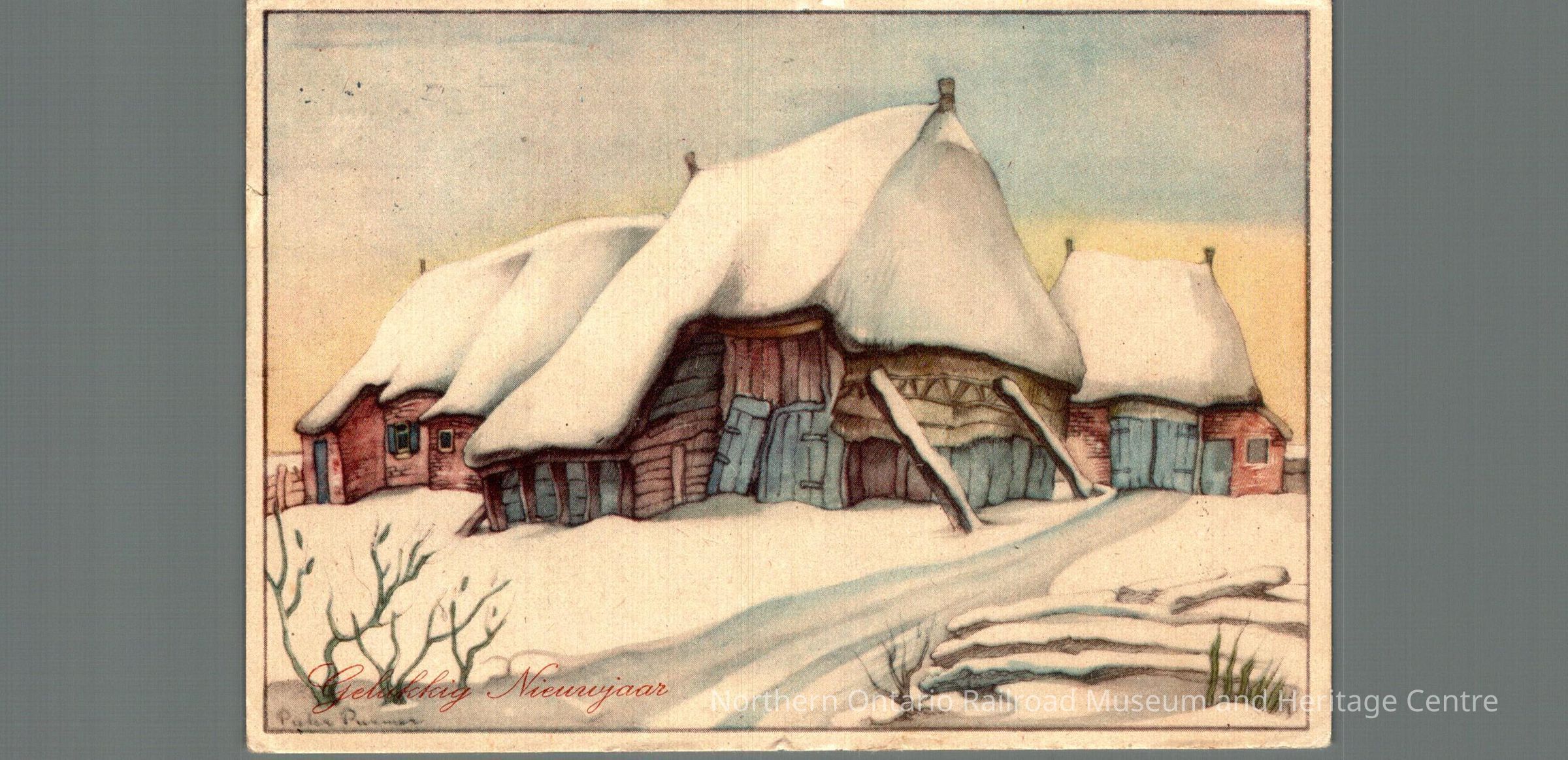 Postcard sent to Mr. M and D Carrise in Capreol ON from the Netherlands in 1947. Text is in Dutch, front image is of a snow covered house captioned "Gelukkig Nieuwjaar" (happy new year)Context
