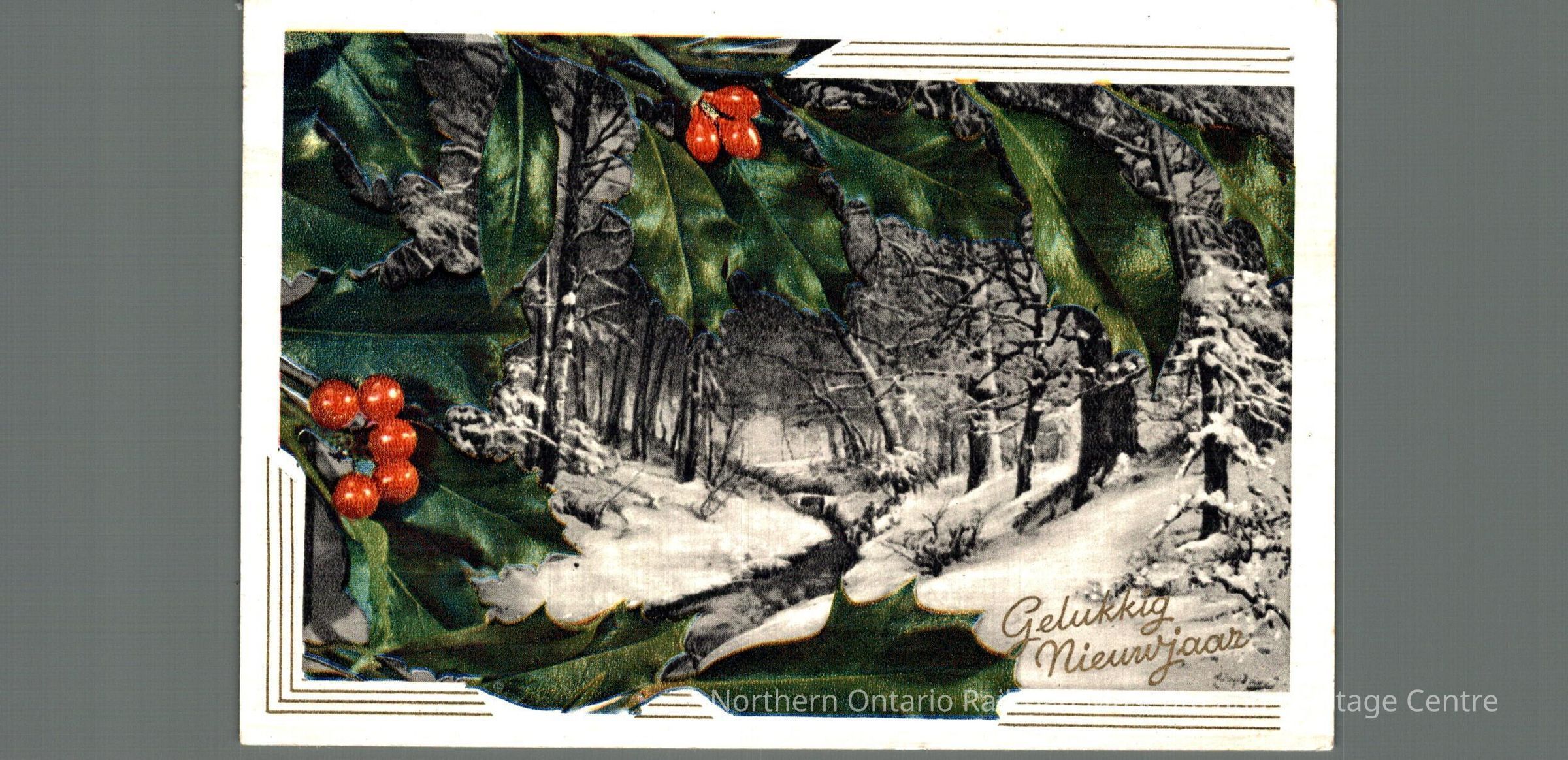 Postcard sent to Mrs. D Carrise in Capreol ON from the Netherlands sometime between 1946-1948 stamp is unclear. Signature on back, front image is of a wintery scene captioned "Gelukkig Nieuwjaar"Context