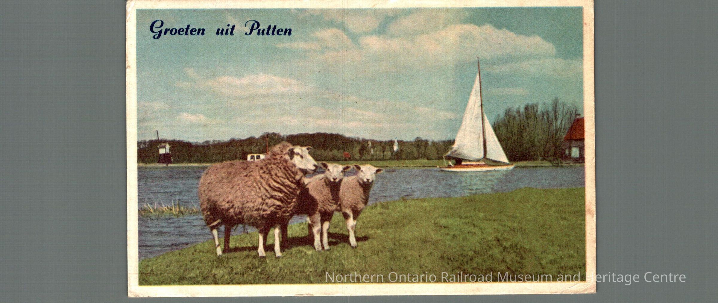 Postcard sent to Mr. and Mrs. M Carrise in Ottawa ON from the Netherlands in 1946. Text is in Dutch, front image is of two sheep in a field in front of a river, there is a boat on the river. It is captioned "Groeten uit Putten"Context