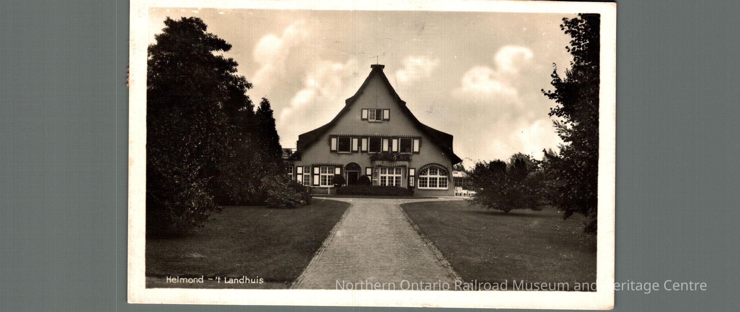 Postcard sent to Mr. and Mrs. M Carrise in Ottawa ON from the Netherlands in 1946. Text is written in English. Front image is of a house captioned "Helmond -'t Landhuis" and in the postcard, the writers announce that they spend their holidays at that house.Context