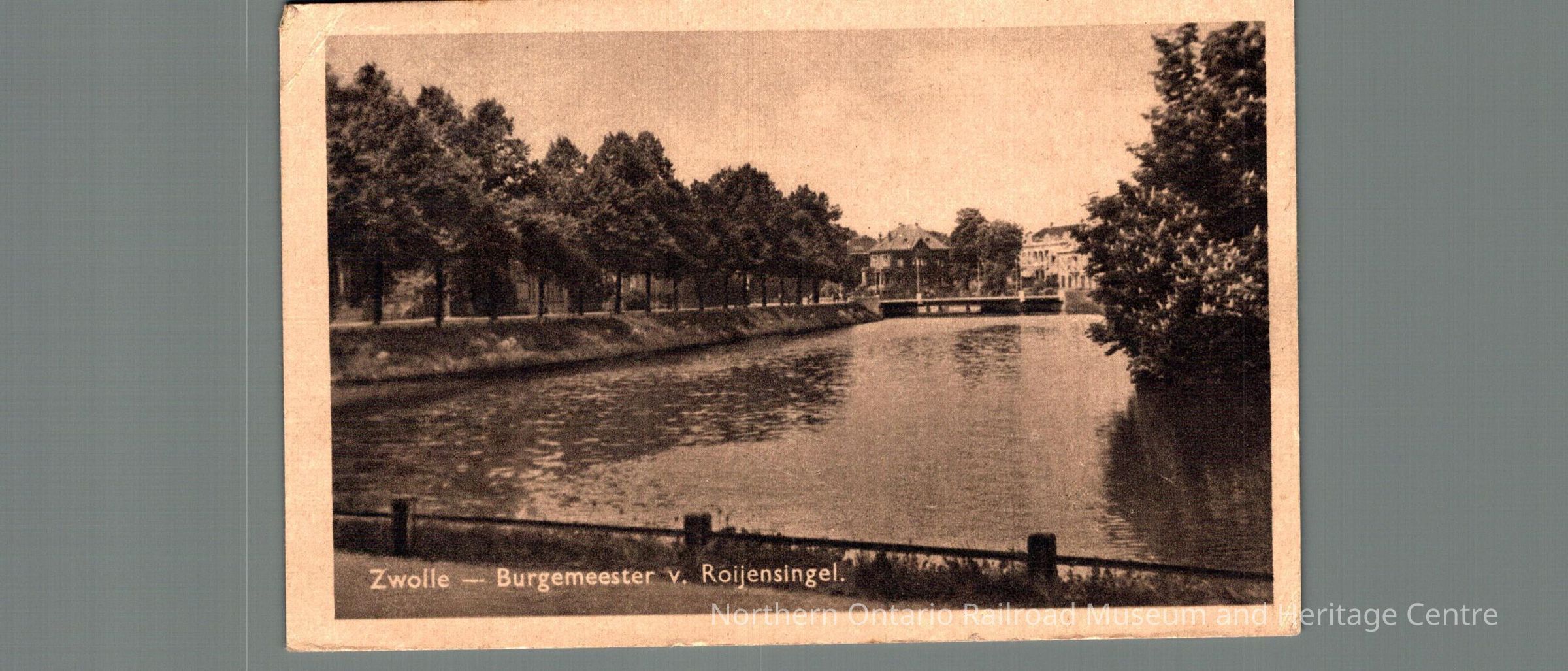 Postcard sent to Mrs. D Carrise in Ottawa ON from the Netherlands in 1946. Text is a signature, front image is of a river captioned "Zwoole Burgemeester v. Roijensingel"Context