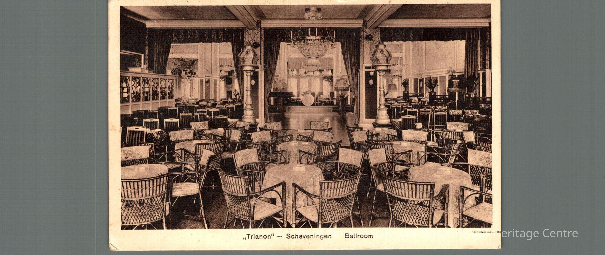 Postcard sent to Mrs. M Carrise in Ottawa ON from the Netherlands in 1946. Text is signatures, front image is of a ballroom captioned "Trianon Scheveningen Ballroom"Context