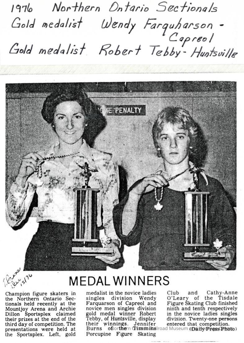 Document, 1976 Northern Ontario Sectionals Gold Medalist Wendy Farquharson, Capreol, Gold Medalist Robert Tebby, Huntsville.Collection
