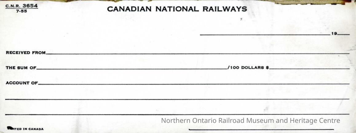 Document, Canadian National Railways, Blank Cheque Receipt Form, CNR 3654.Collection