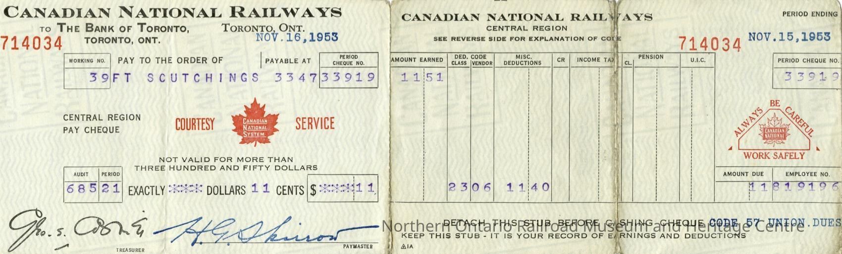 Document, Canadian National Railways Cheque, FT Scutchings, November 16 1955.Collection