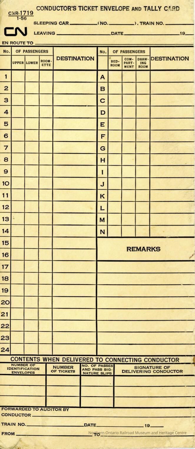 Document, Canadian National Railways, Conductor's Ticket Envelope and Tally Card, CNR 1719.Collection