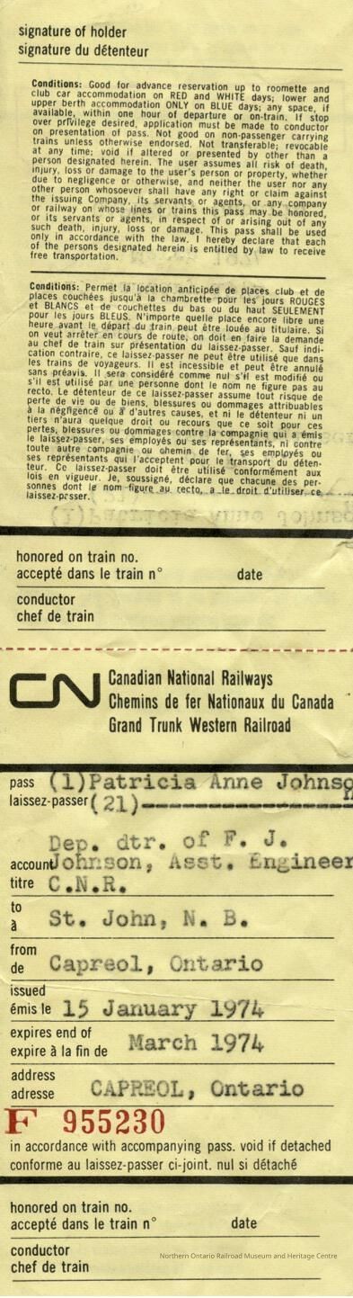 Document, Canadian National Railways Dependants Pass, St John-Capreol Patricia Anne Johnson, Expired March 1974.Entry/Object ID