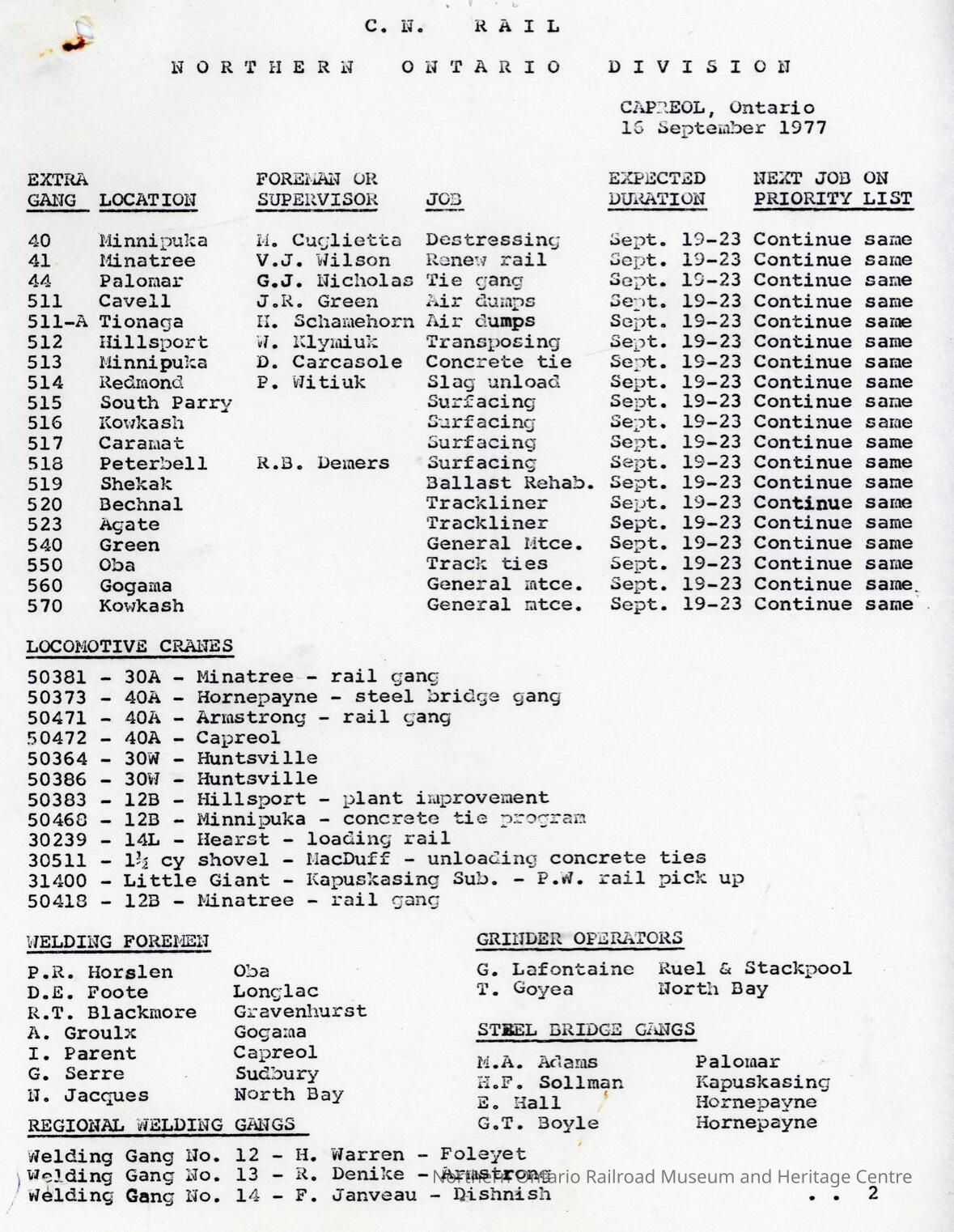 Document, Canadian National Railways, Northern Ontario Area, Capreol Ontario Location Reports, 16 September 1977.Collection