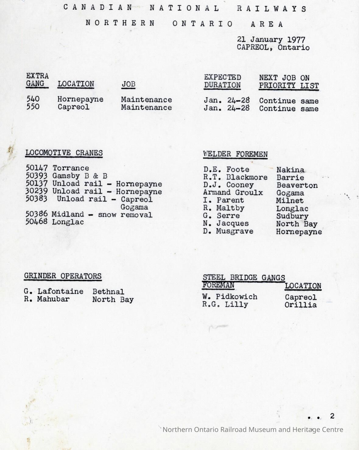 Document, Canadian National Railways, Northern Ontario Area, Capreol Ontario Location Reports, 21 January 1977.Collection