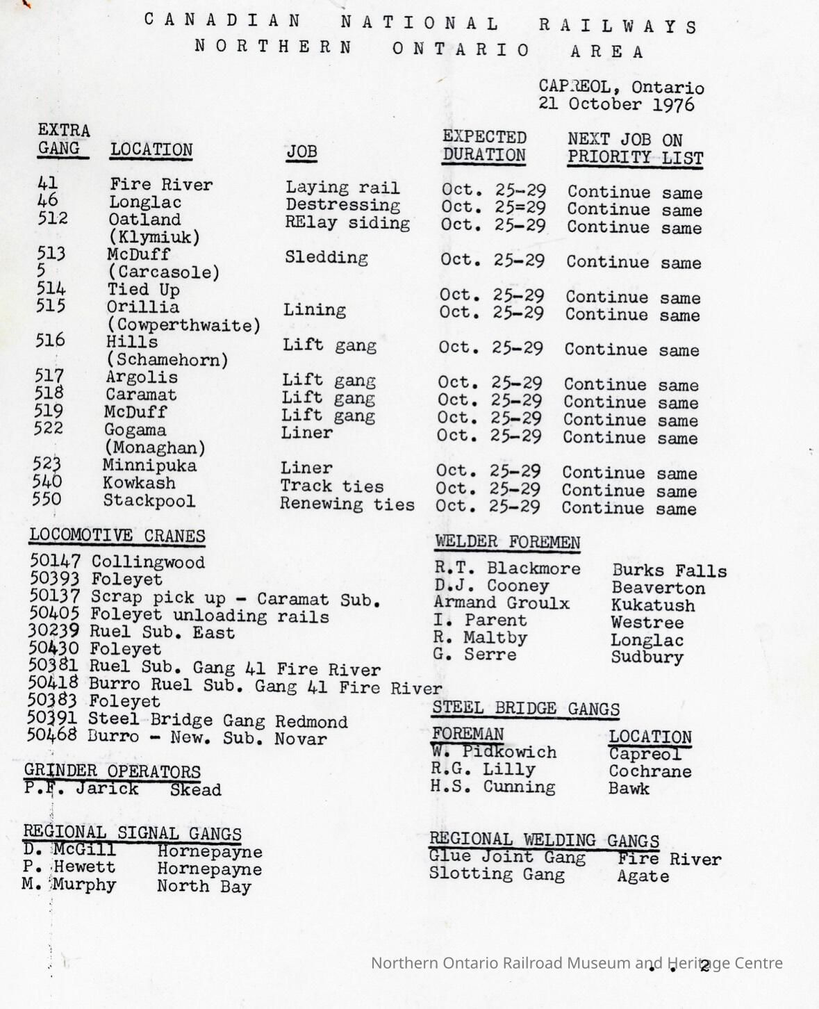 Document, Canadian National Railways, Northern Ontario Area, Capreol Ontario Location Reports, 21 October 1976.Collection
