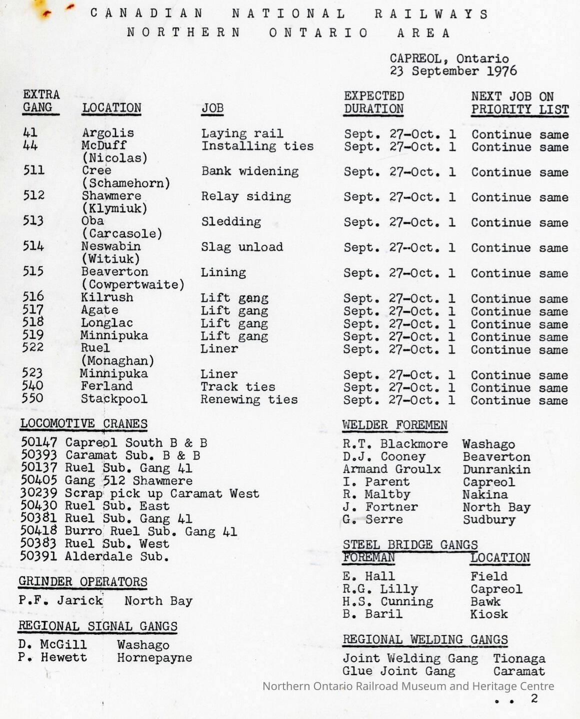 Document, Canadian National Railways, Northern Ontario Area, Capreol Ontario Location Reports, 23 September 1976.Collection