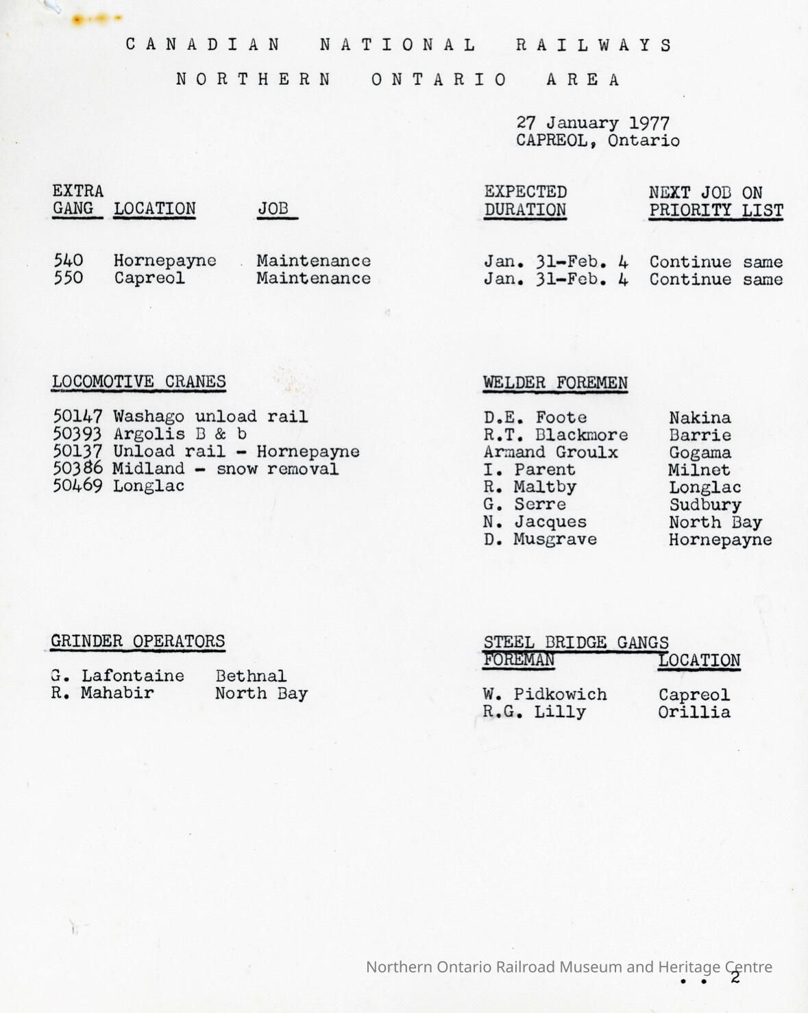 Document, Canadian National Railways, Northern Ontario Area, Capreol Ontario Location Reports, 27 January 1977.Collection