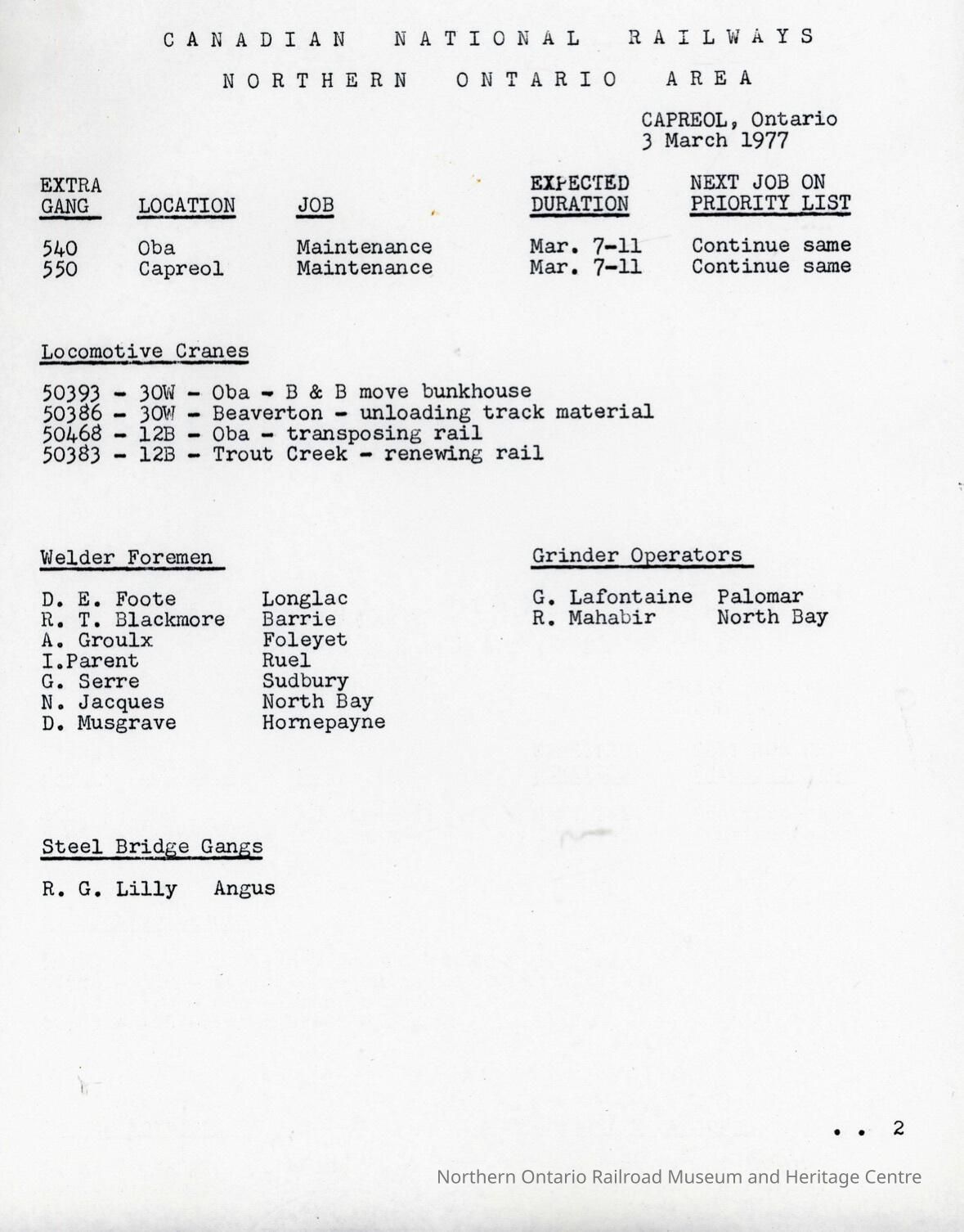 Document, Canadian National Railways, Northern Ontario Area, Capreol Ontario Location Reports, 3 March 1977.Collection