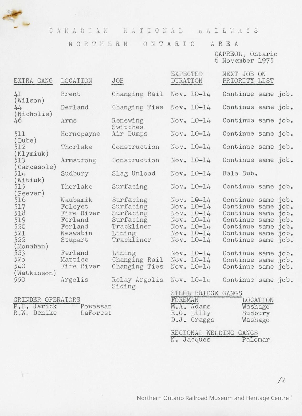 Document, Canadian National Railways, Northern Ontario Area, Capreol Ontario Location Reports, 6 November 1975.Collection