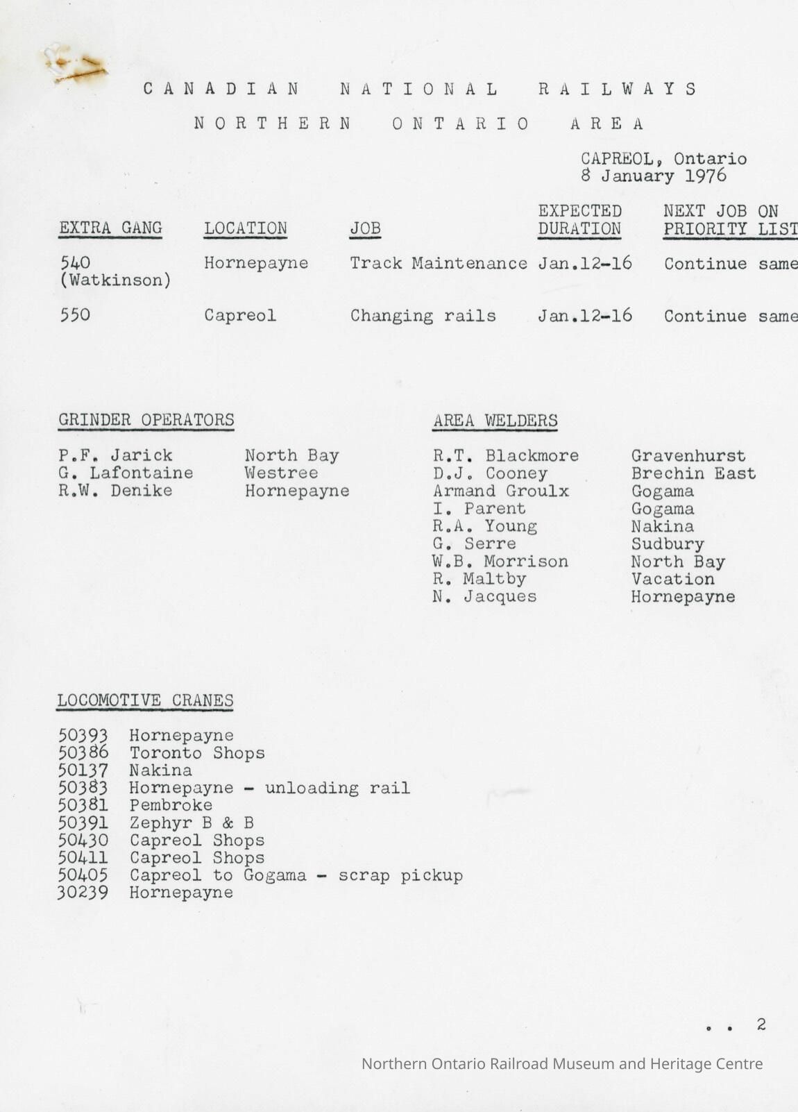 Document, Canadian National Railways, Northern Ontario Area, Capreol Ontario Location Reports, 8 January 1976.Collection