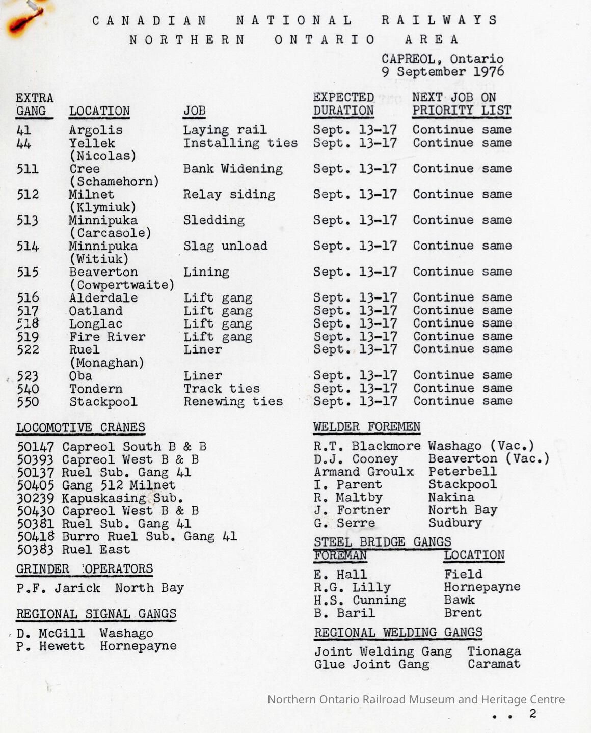 Document, Canadian National Railways, Northern Ontario Area, Capreol Ontario Location Reports, 9 September 1976.Collection