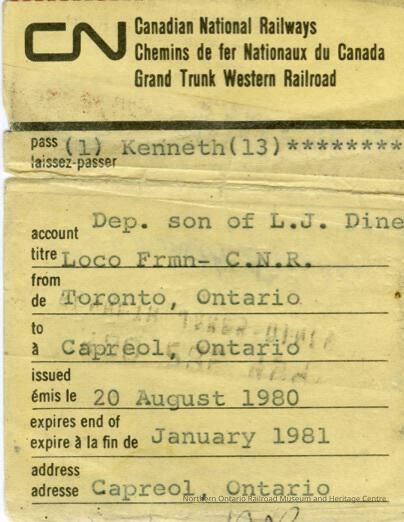 Document, Canadian National Railways pass, Kenneth Dine, Loco Fireman, Between Toronto and Capreol, August 20 1980-January 1981.Collection