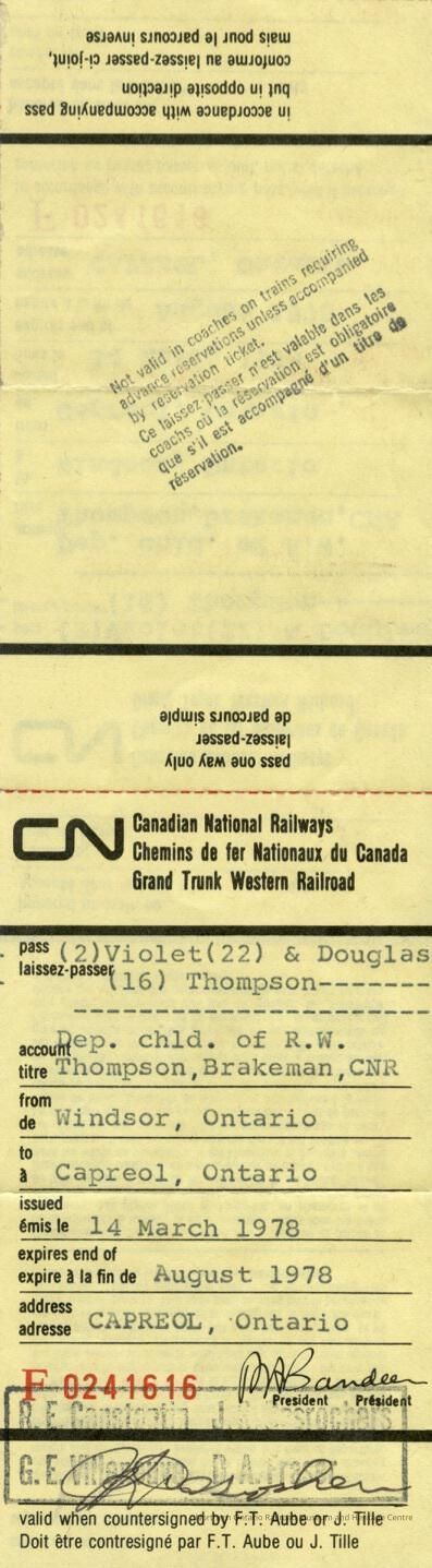 Document, Canadian National Railways Windsor-Capreol Pass, Violet and Douglas Thompson Dependant Child Pass, 1973-1975.Collection