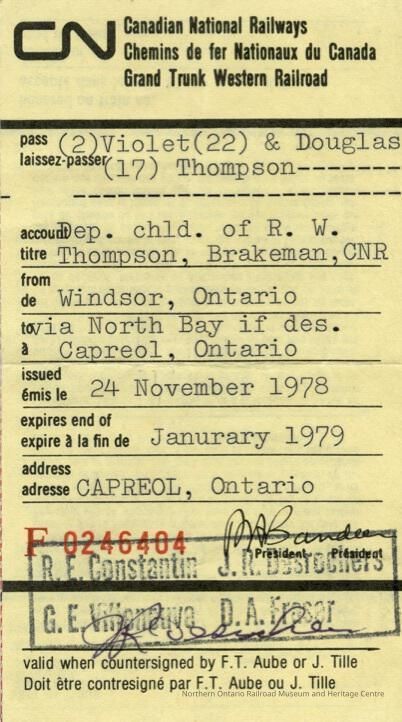 Document, Canadian National Railways Windsor to Capreol Dependant Child Pass, Violet Marie and Douglas Thompson Pass, 1978-1979.Collection