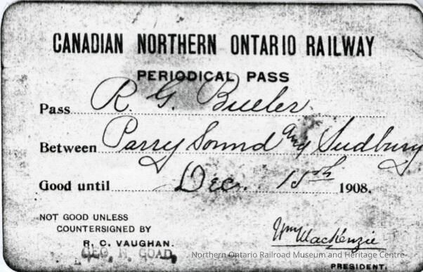 Document, Canadian Northern Ontario Railway Periodical Pass, RG Bueler, Between Parry Sound and Sudbury, Expired December 15th 1908.Collection
