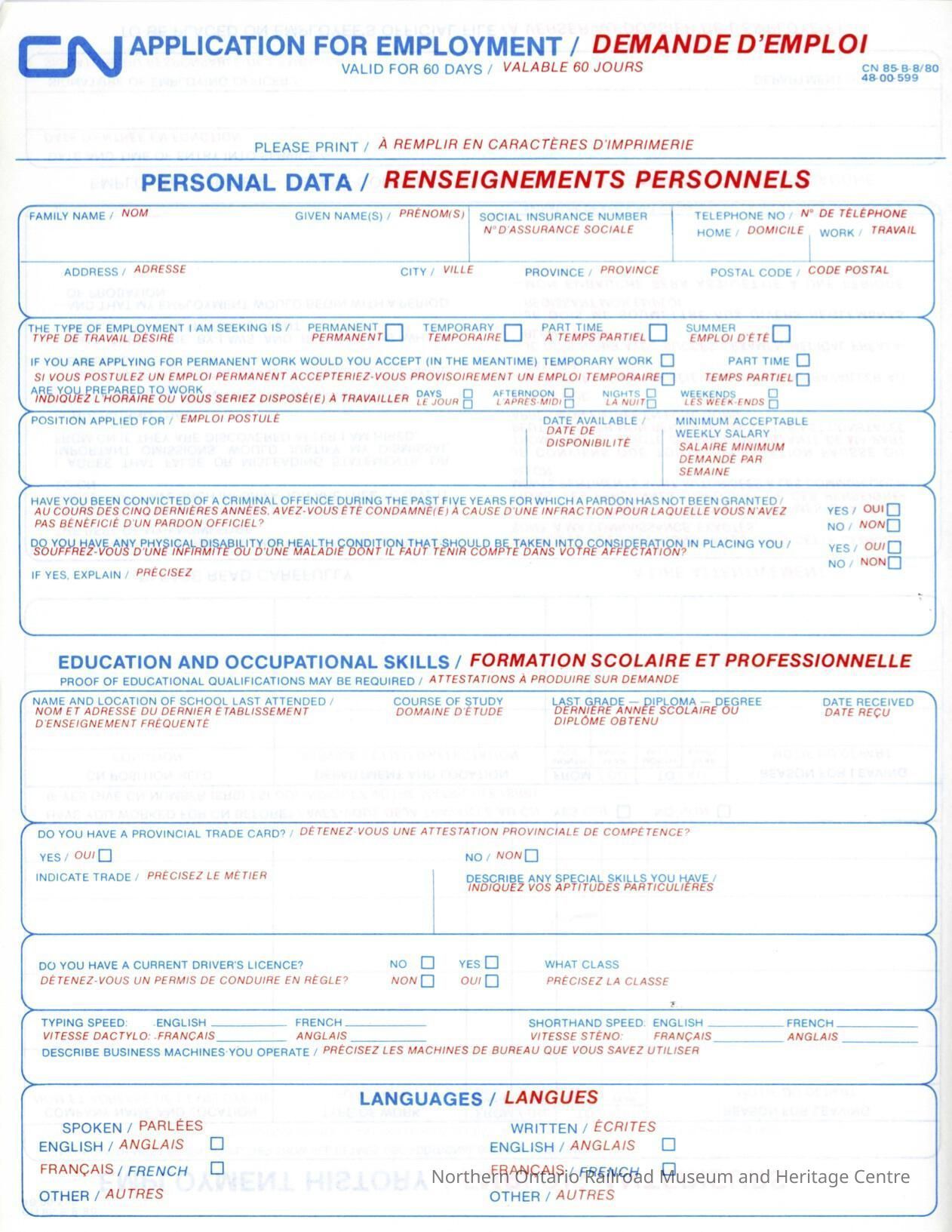 Document, CN Application for Employment Form, CN 85-8-8/80, Blank.Collection