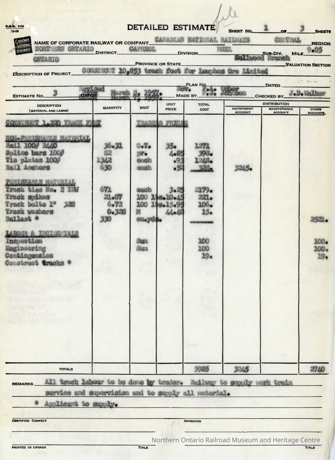 Document, CN Detailed Estimate, Construct 10,853 Track Feet for Lowphos Ore Limited.Collection